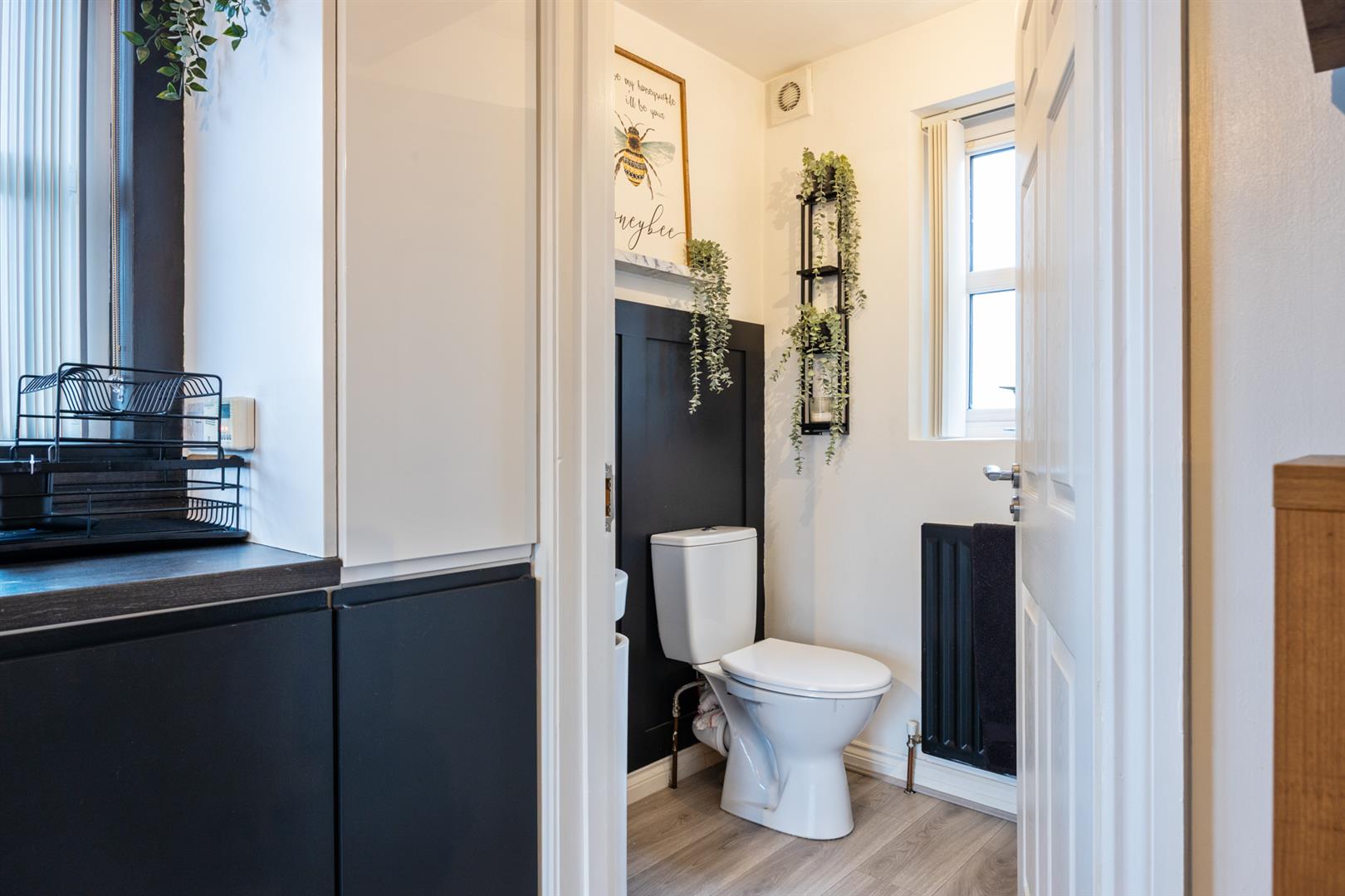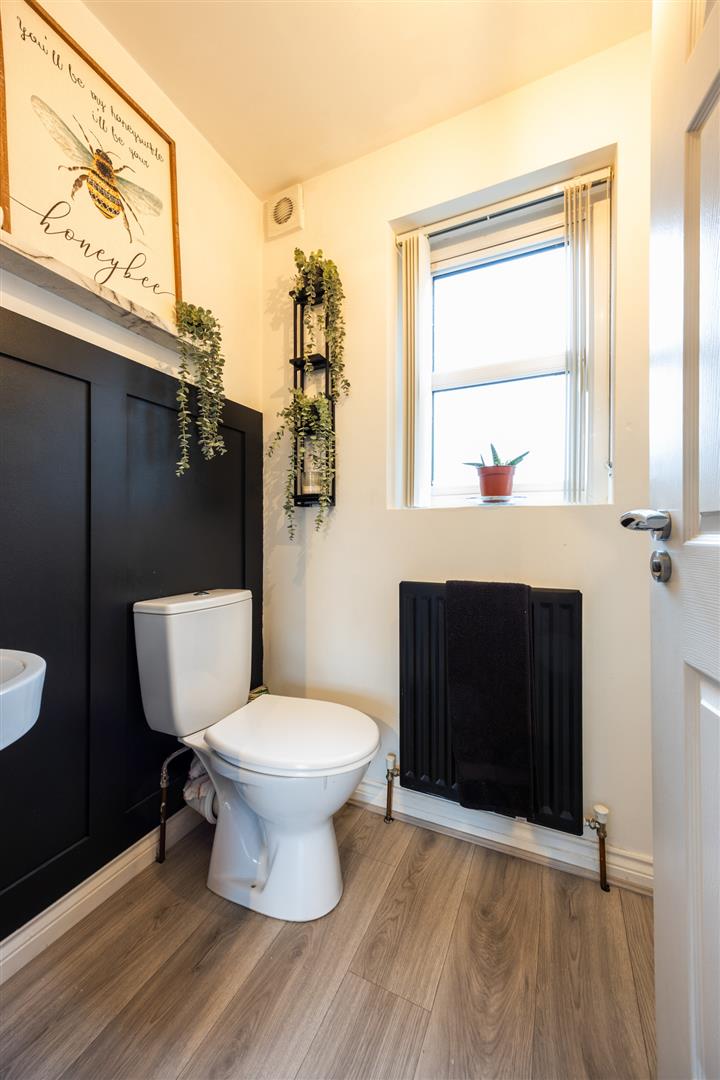 White suite encompassing low flush W/C and wash hand basin. Storage cupboard.