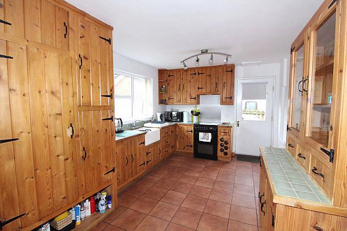 Range of high and low level units with tiled worksurfaces, belfast sink, cooker space, stainless steel splashback, fridge/freezer space, ceramic tiled floor, single panel radiator, double panel radiator, patio door.