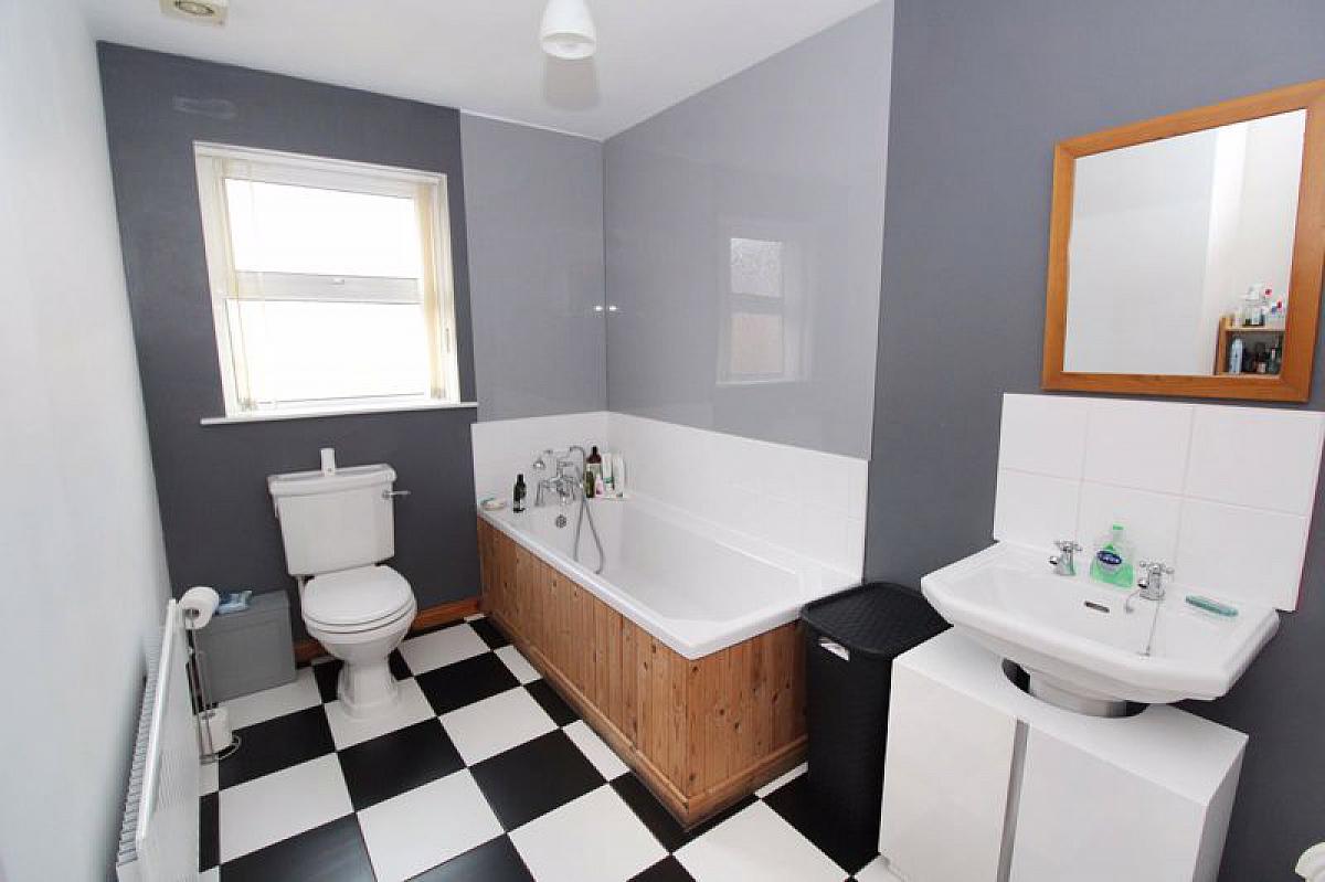 White suite comprising low flush WC, pedestal wash hand basin and panel bath with mixer tap and shower attachment. Part tiled walls, ceramic tiled floor, extractor fan, single panel radiator.