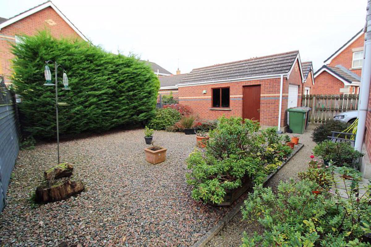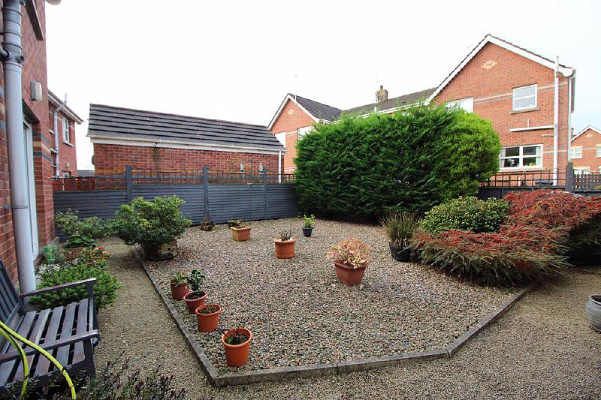 Front garden laid in lawn, driveway parking. Rear garden laid in stone, outside light and tap, plastic oil tank.