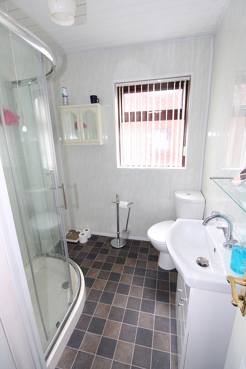 White suite comprising low flush WC, vanity sink unit and shower cubicle with electric shower unit. PVC panelled walls and ceiling, hotpress shelved and lagged, chrome towel rail.