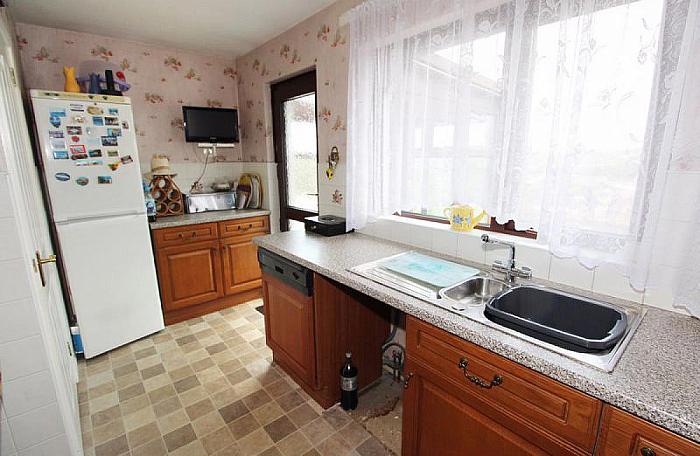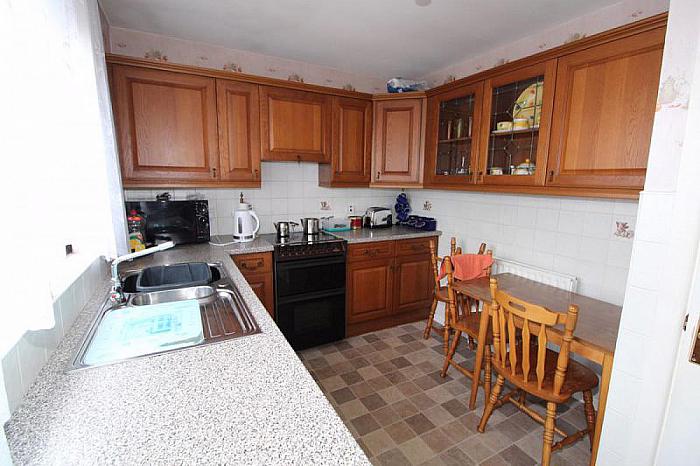Extensive range of high and low level units with complementary worksurfaces, 1 1/2 bowl stainless steel sink unit and mixer tap, cooker space, integrated dishwasher, plumbed for automatic washing machine, fridge/freezer space, glazed display unit, part tiled walls, uPVC rear door.
