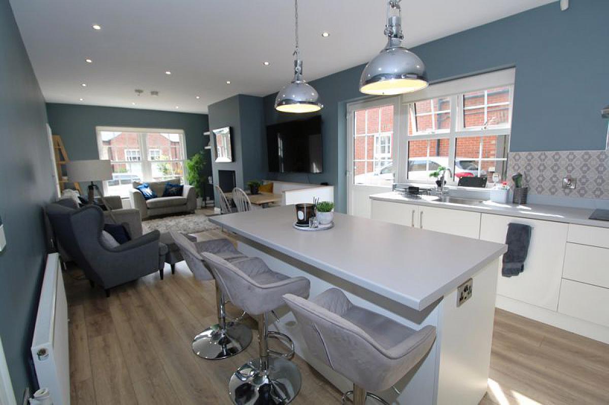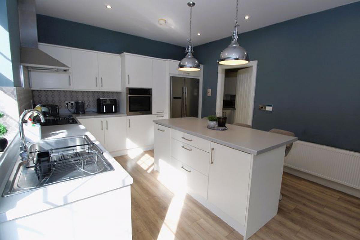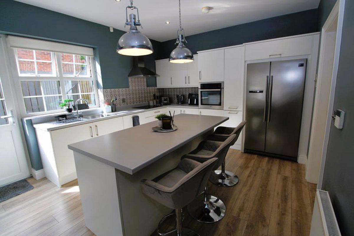 Modern fitted kitchen with feature centre island breakfast bar, stainless steel sink unit with mixer tap, built-in oven and 4 ring hob and stainless steel extractor fan, integrated dishwasher, american style fridge/freezer space, centre island lighting. Part tiled walls, laminate wooden floor.
