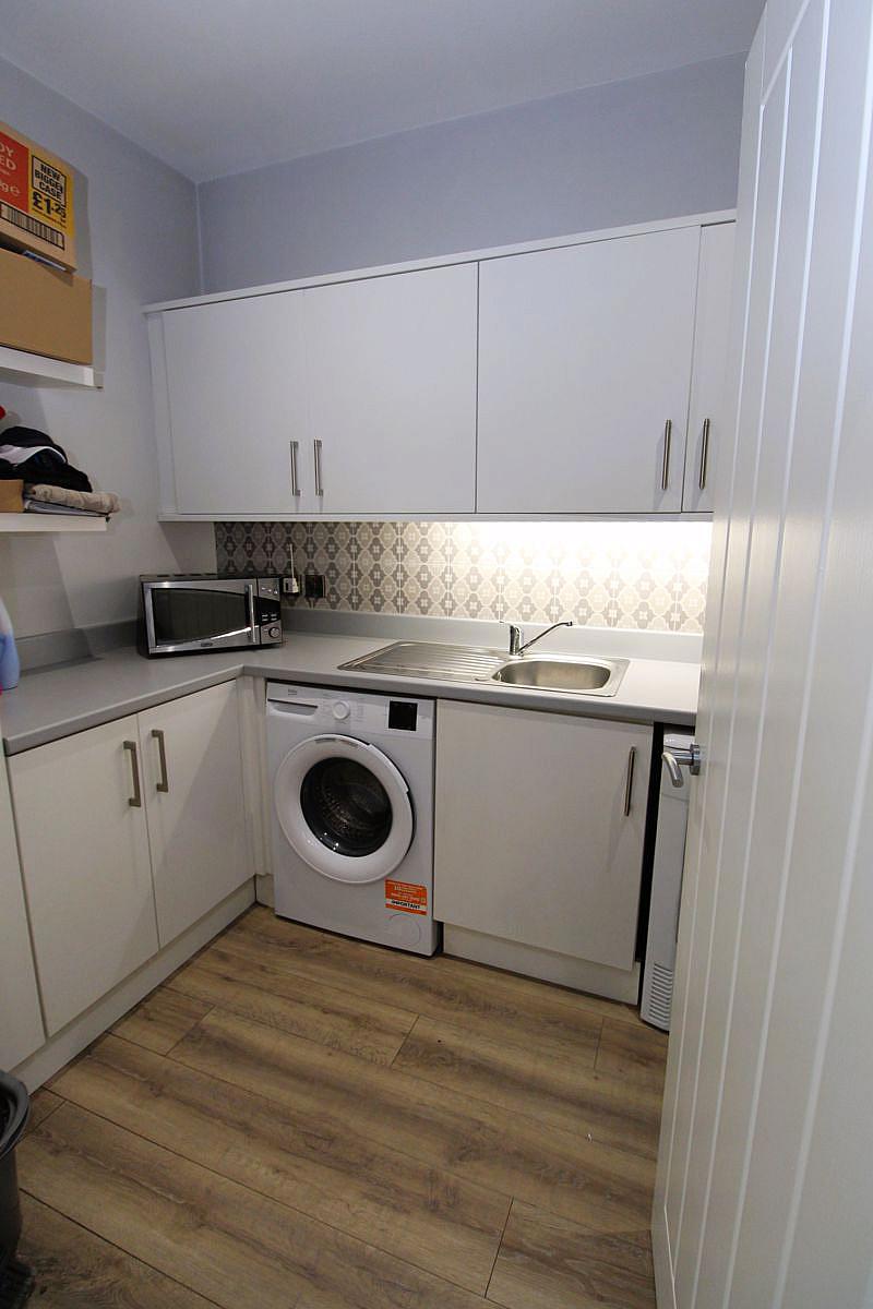 Range of matching kitchen units, stainless steel sink unit with mixer tap, plumbed for automatic wahsing machine, tumble dryer space, laminate wooden floor, part tiled walls, radiator.