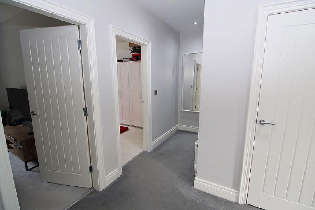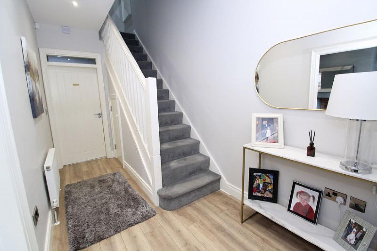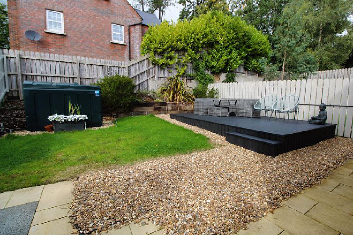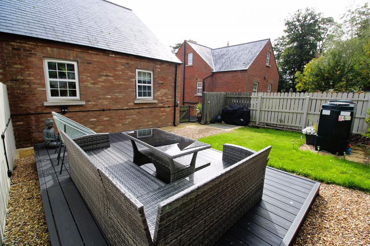 Front laid in paving with estate style railings, steps leading to a fully enclosed rear garden laid in lawns with a feature composite decked area. Outside lighting and tap, Enclosed bin storage area, tarmac driveway.
