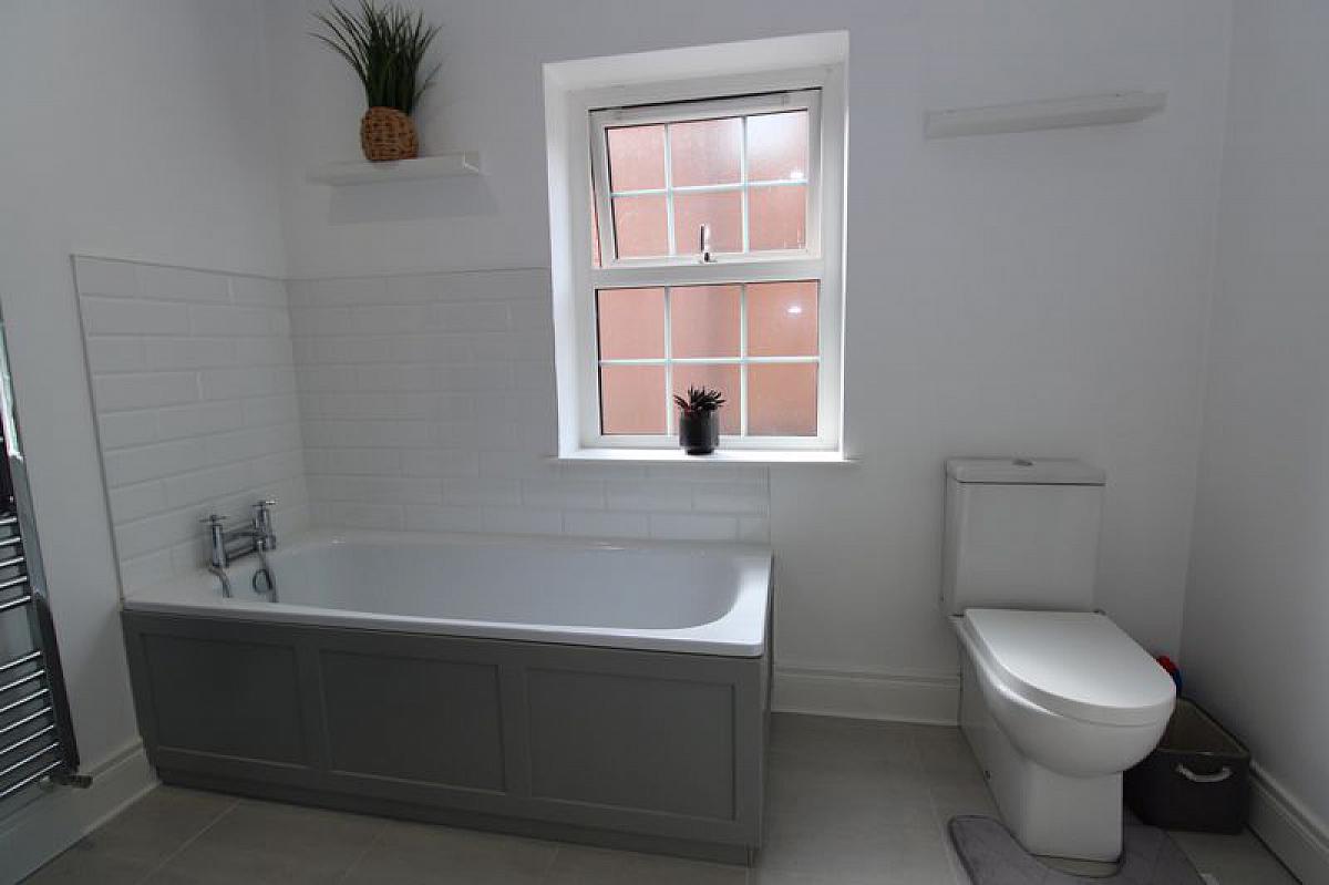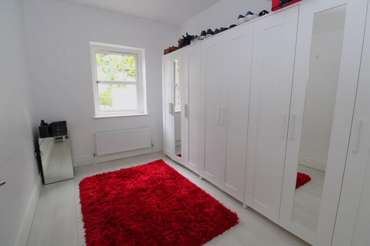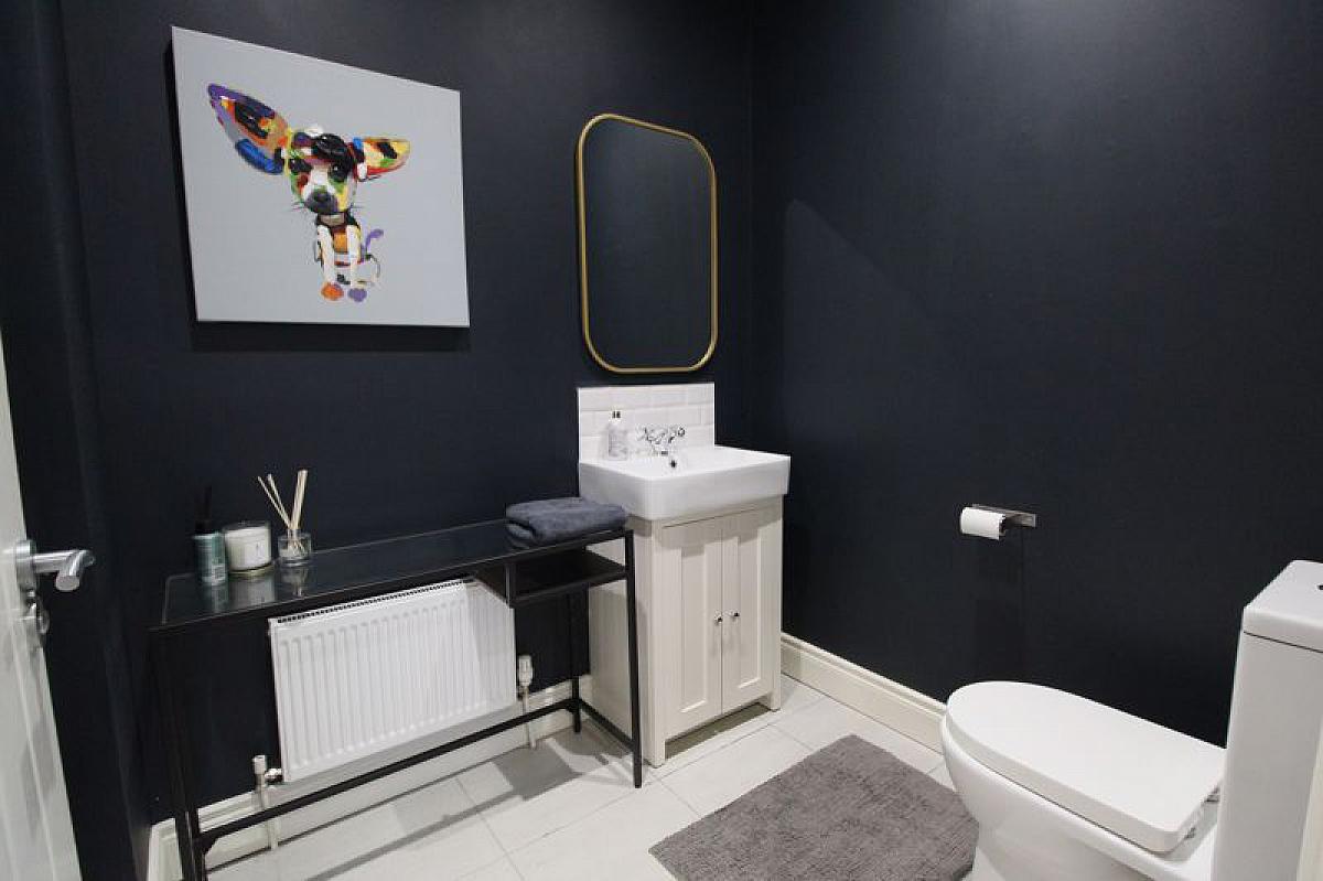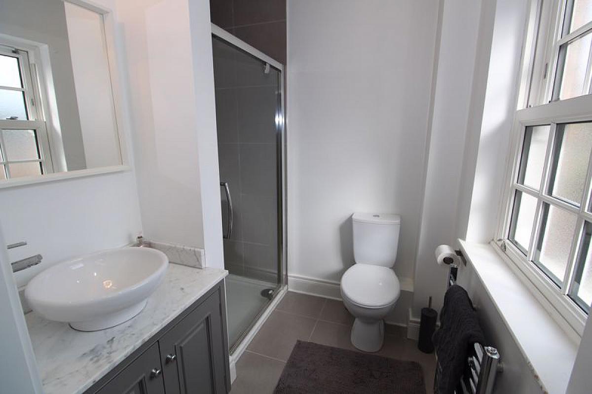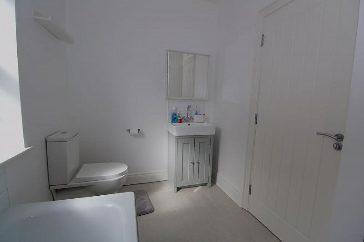 Spacious cloaks WC comprising low flush WC and vanity sink unit, ceramic tiled floor, radiator.