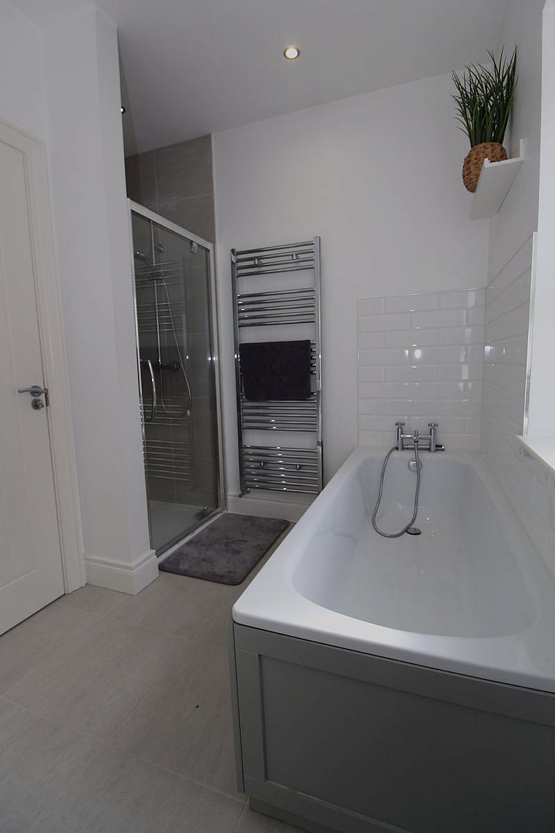 Luxury white suite comprising low flush WC, vanity sink unit, panel bath with shower attachment and shower cubicle. Part tiled walls, ceramic tiled floor, recessed lighting, chrome heated towel rail.