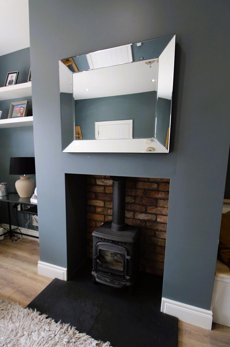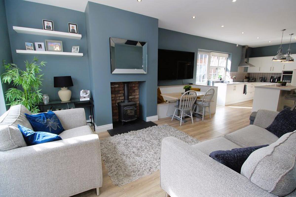 Feature stove with brick inset and slate hearth, laminate wooden floor, open plan to...