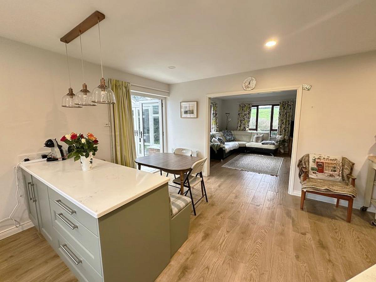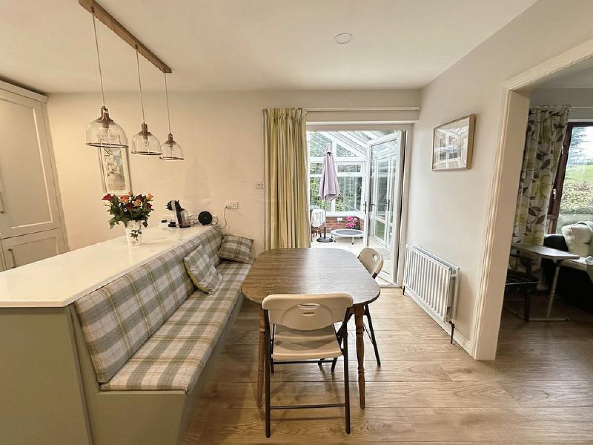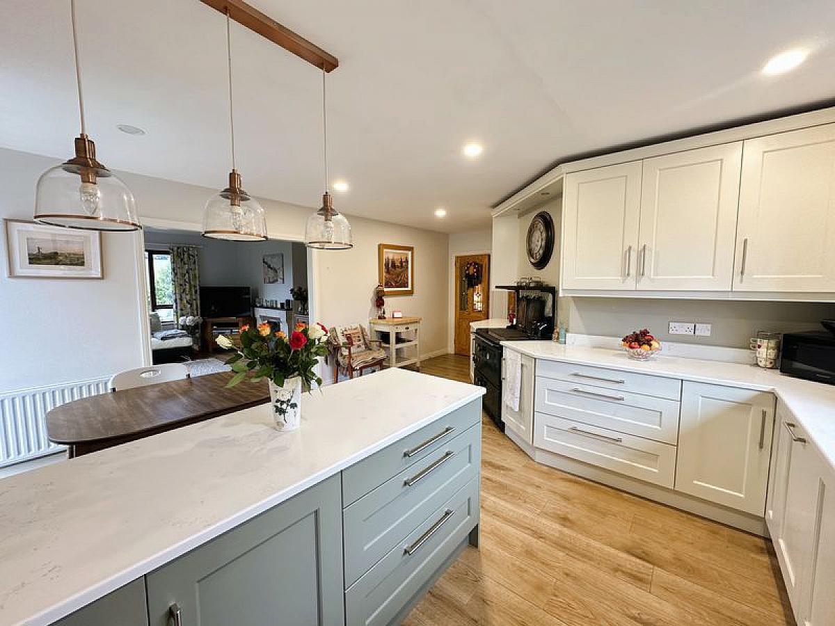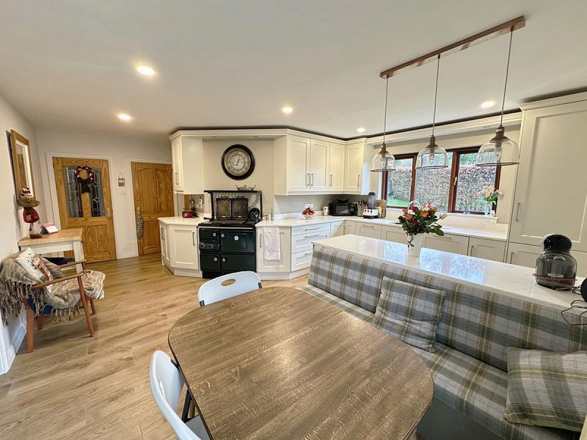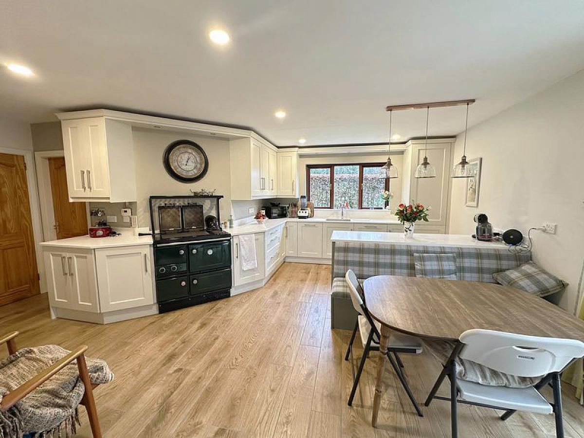 Full range of high and low level fitted modern units with quartz worktops and upstands incorporating 1 1/2 bowl composite sink unit and Quooker hot water tap, window pelmet with low voltage downlighting, worktop lighting and bench seating. Stanley oil fired range with high output back boiler linked to central heating system, built-in fridge/freezer and fully integrated dishwasher, fully tiled floor, double radiator. Open plan to