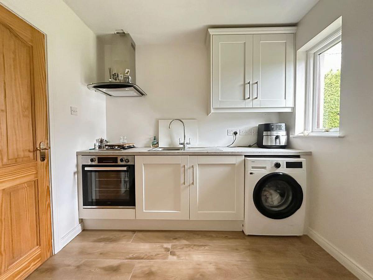 Fitted high and low level modern units with single drainer stainless steel sink unit and mixer tap, built-in electric oven and 2 ring gas hob, stainless steel extractor hood and fan, plumbed for automatic washing machine, tiled floor, vertical radiator, hardwood 1/2 door to rear.