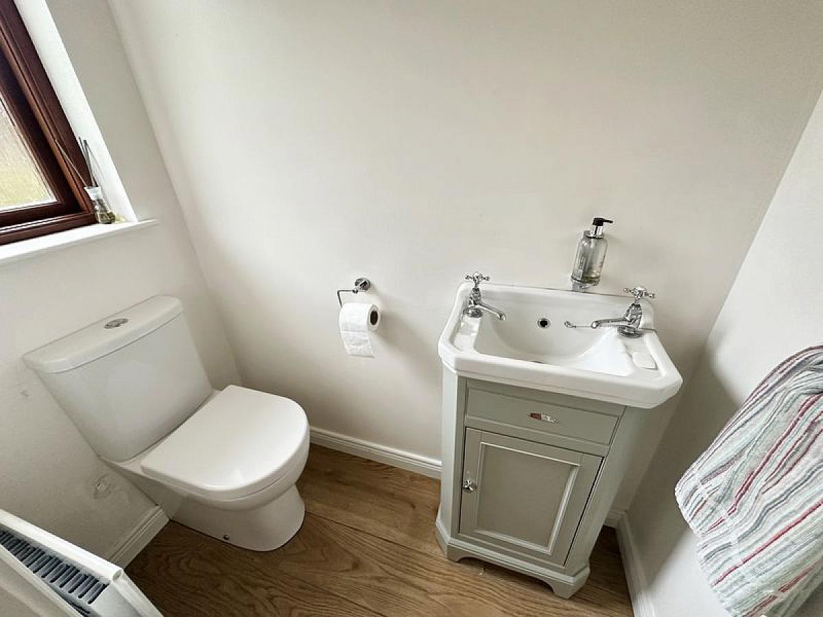 With low flush WC and vanity unit with sink, tiled floor, 1 radiator.