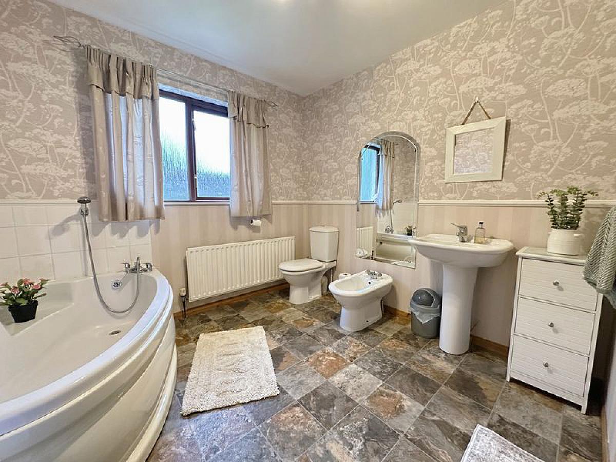 White suite comprising low flush WC, pedestal wash hand basin with mixer tap, bidet, offset bath with mixer tap shower attachment and fully tiled shower enclosure with thermostatic mixer shower, heated towel rail.