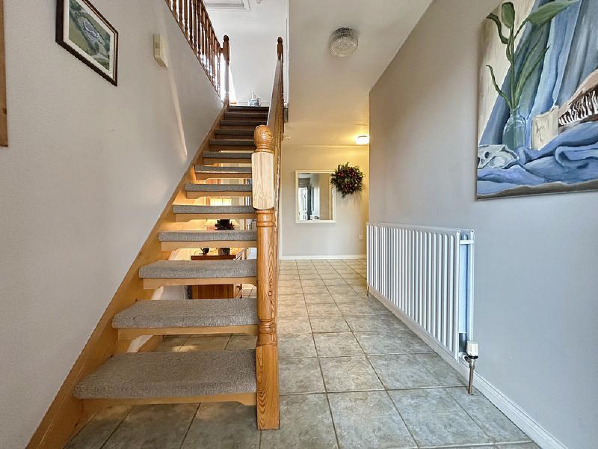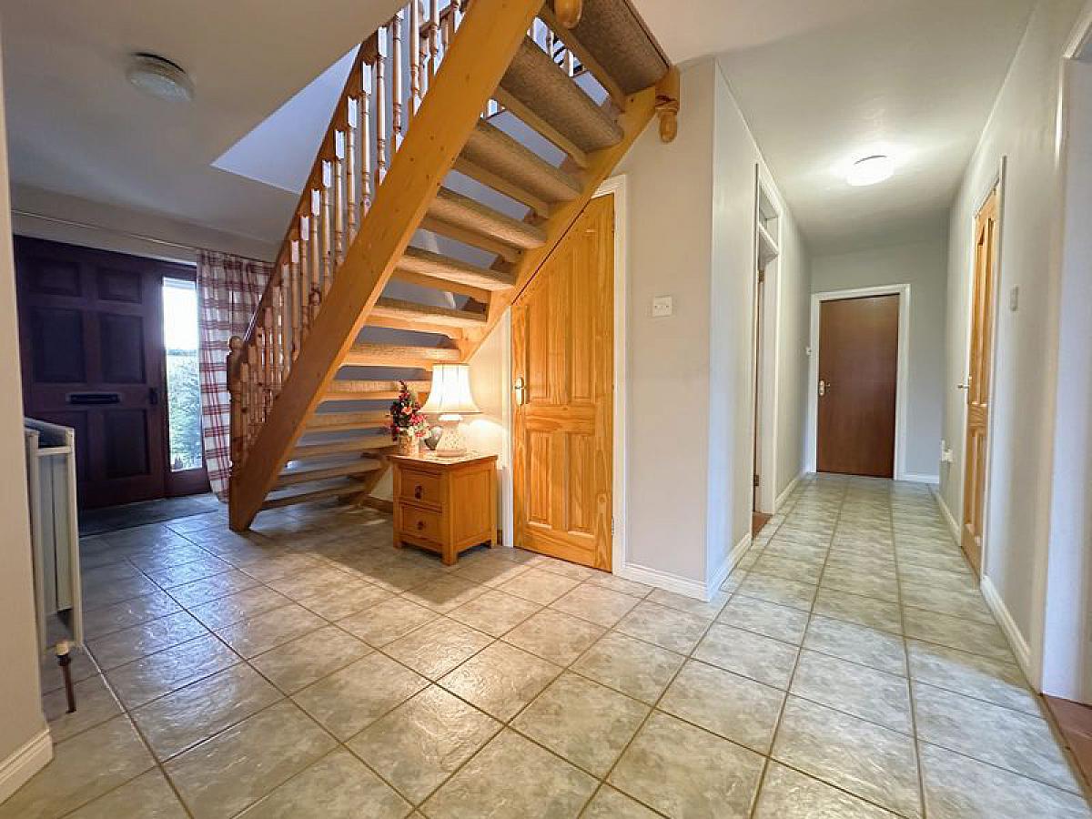 Hardwood panelled front door with double glazed side screen, tiled floor, telephone point, cloaks cupboard, hotpress, double radiator.