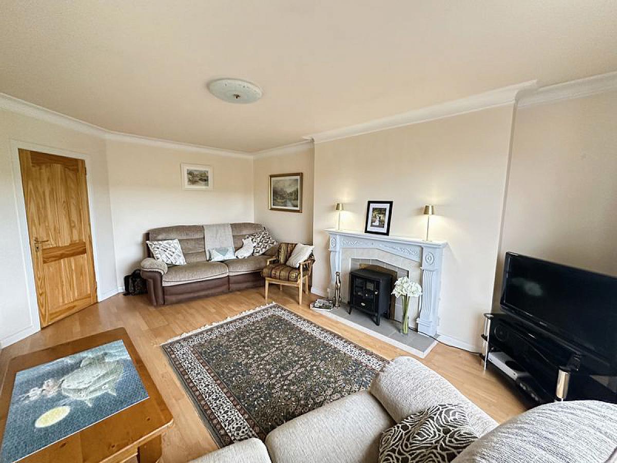 Tiled fireplace and hearth with wooden surround, laminate wooden floor, coved ceiling, TV point, double radiator.