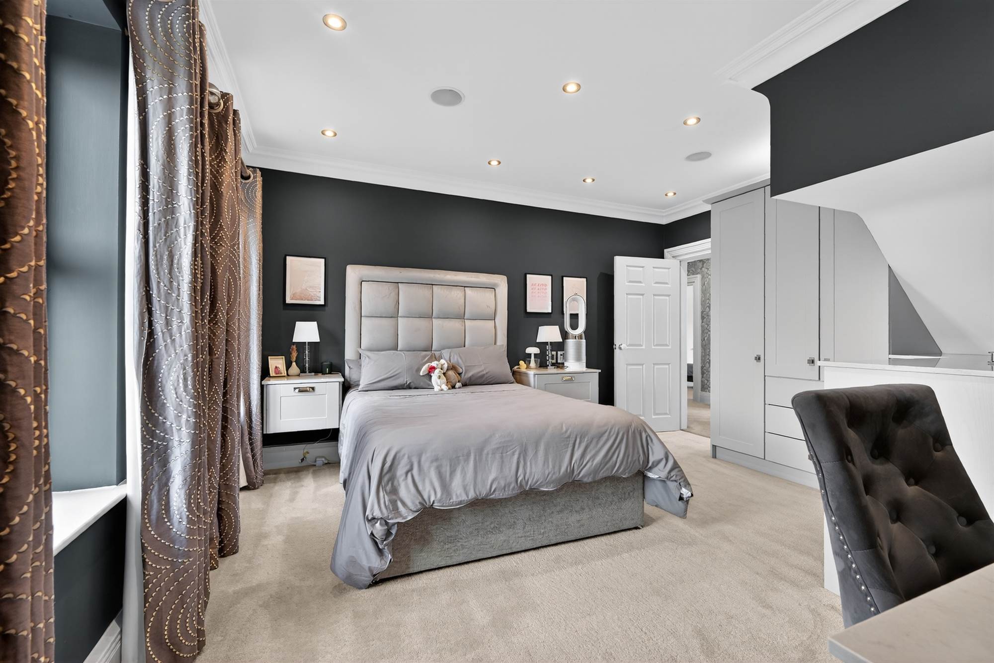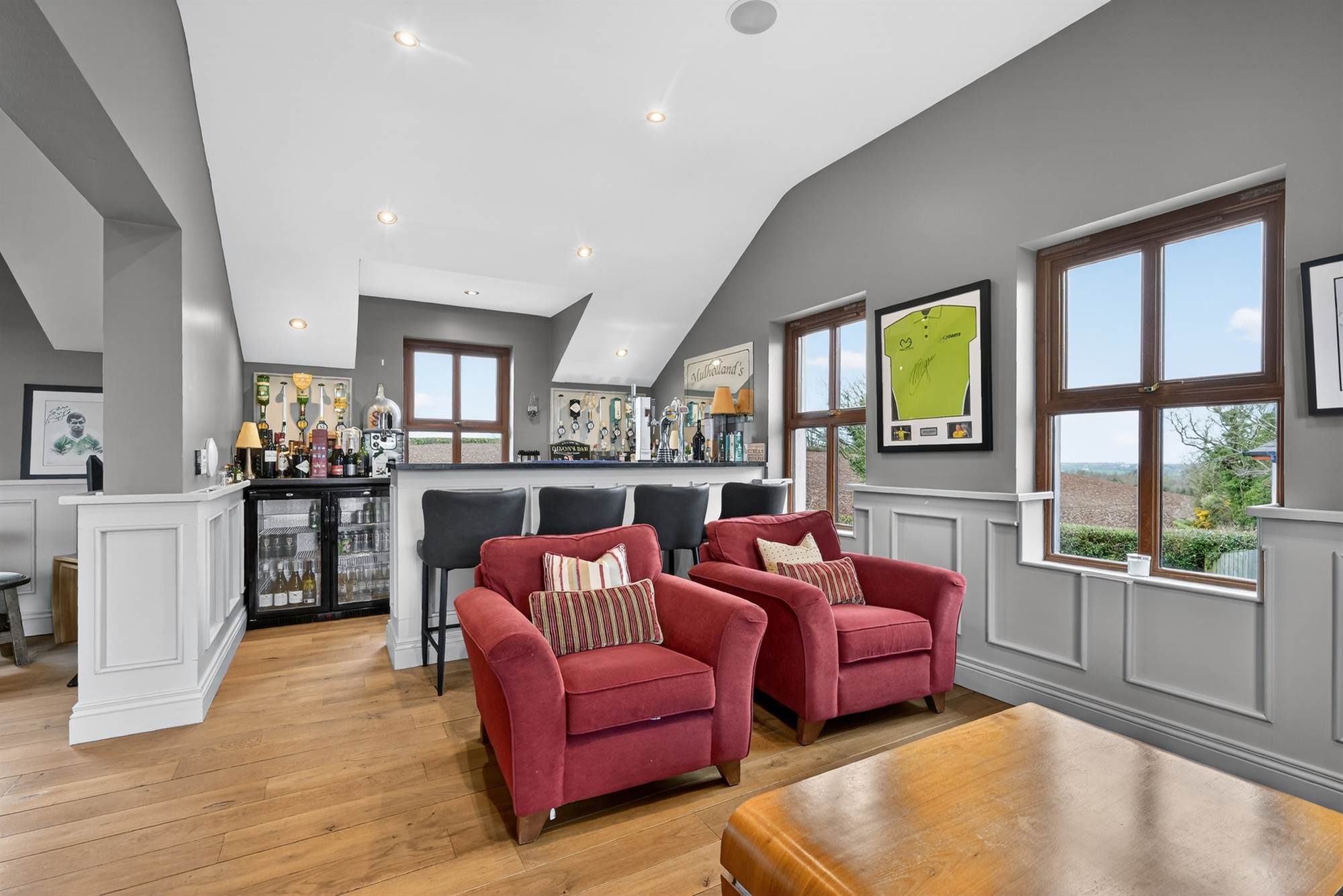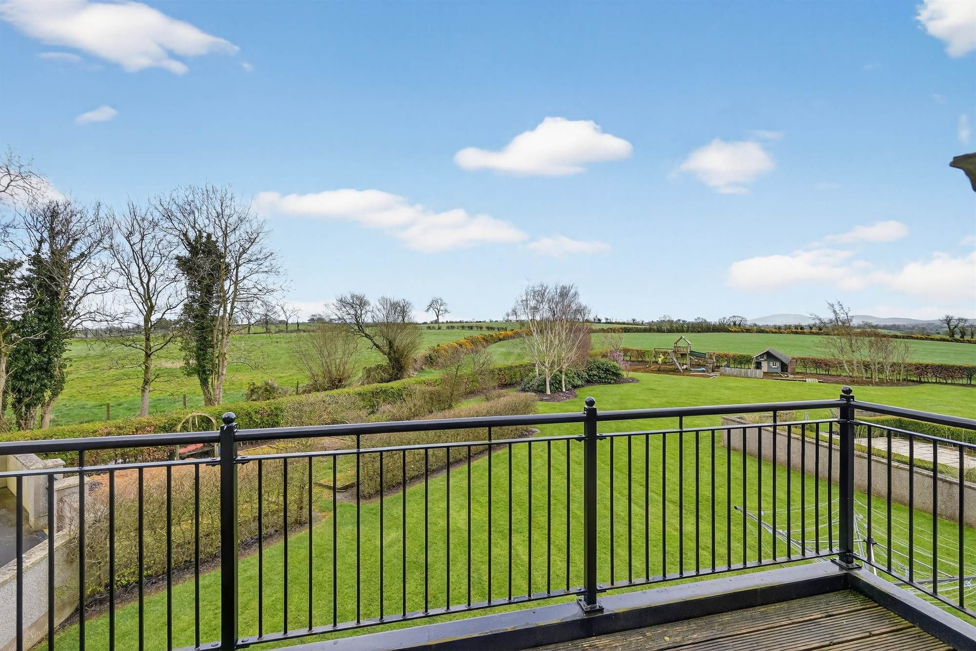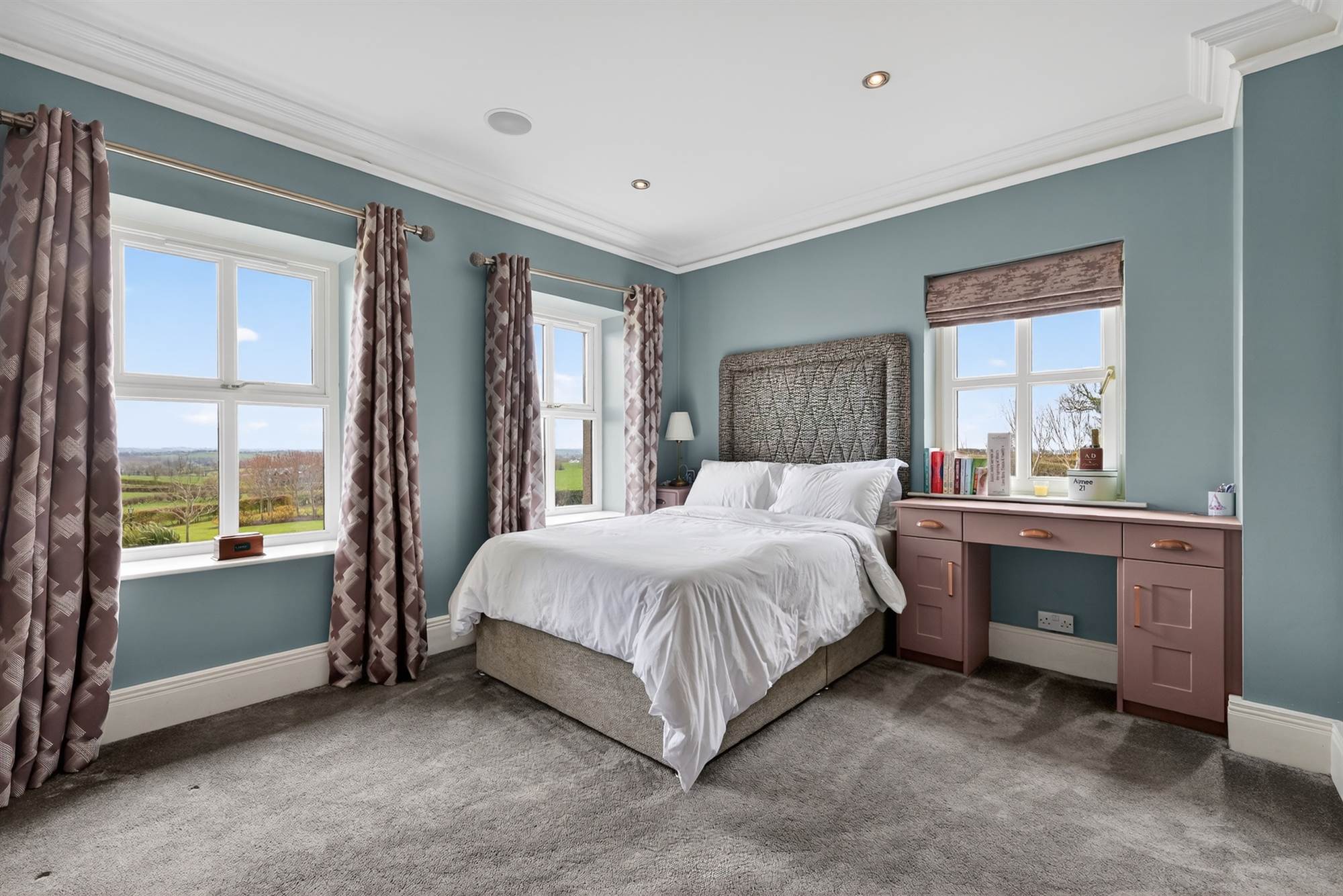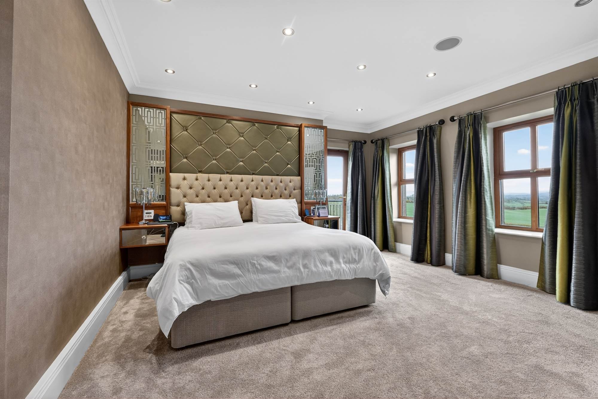 Timber balcony with stunning Co.Down views, cornice ceiling, low voltage spotlighting, built in TV unit, headboard and side tables.