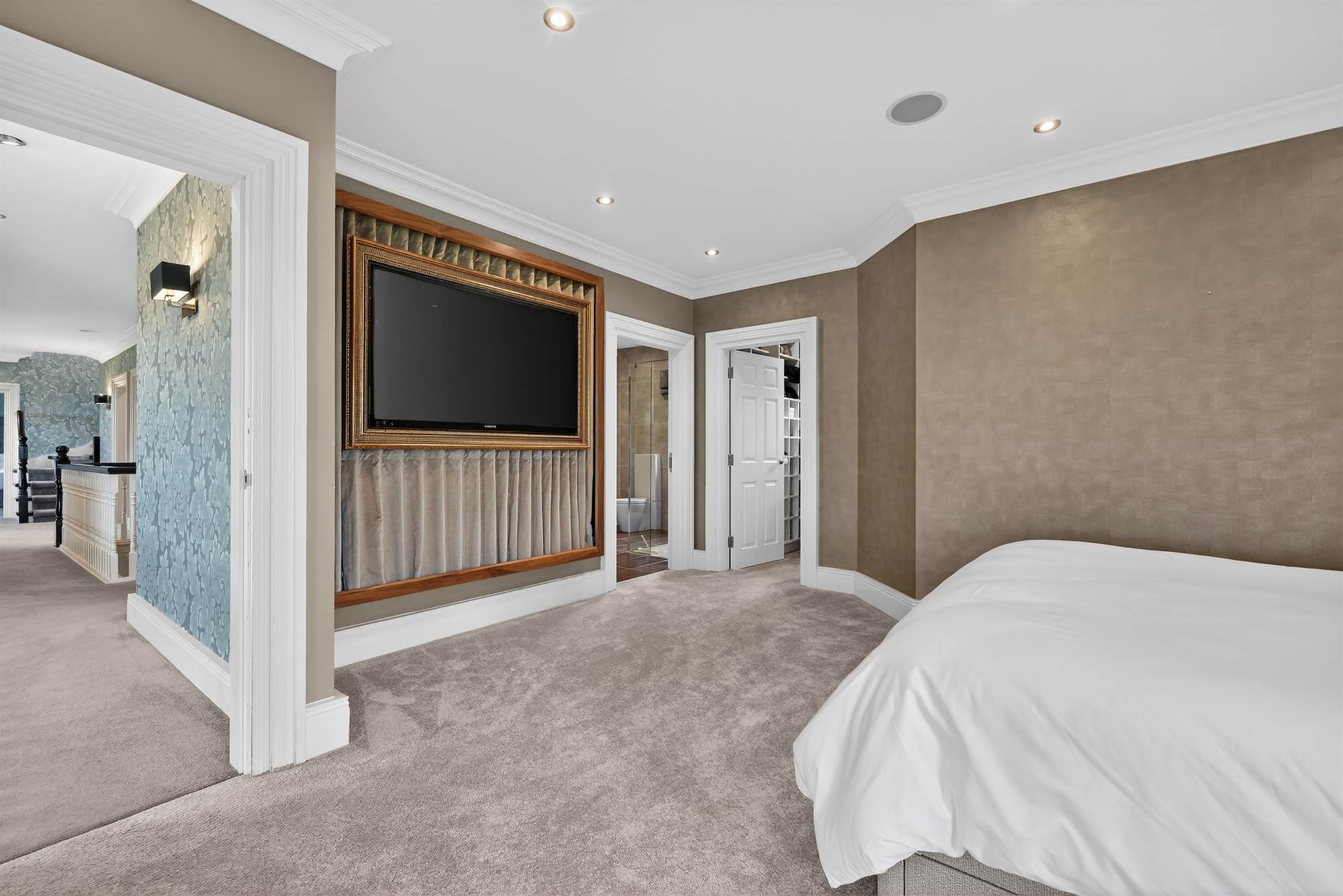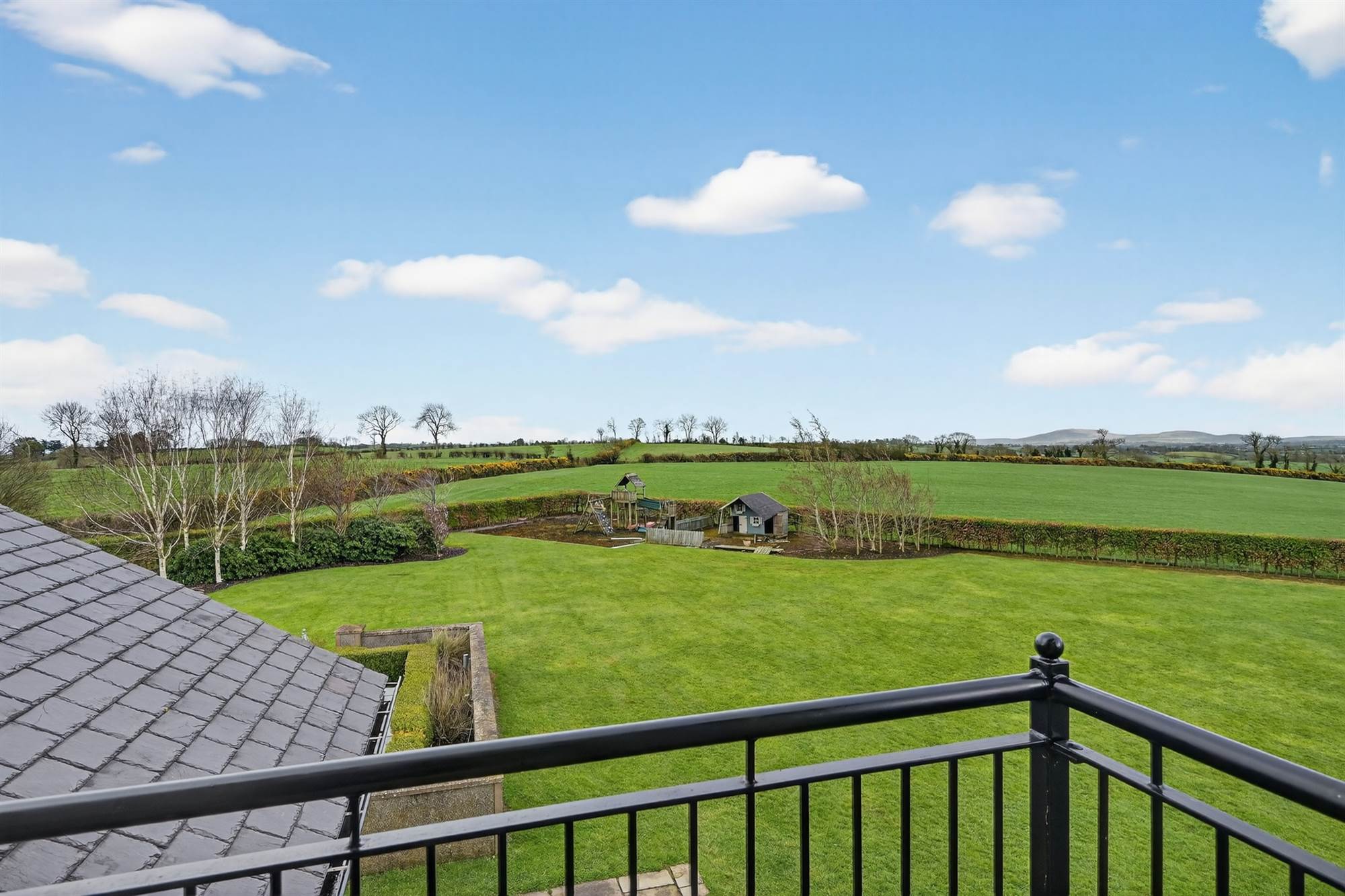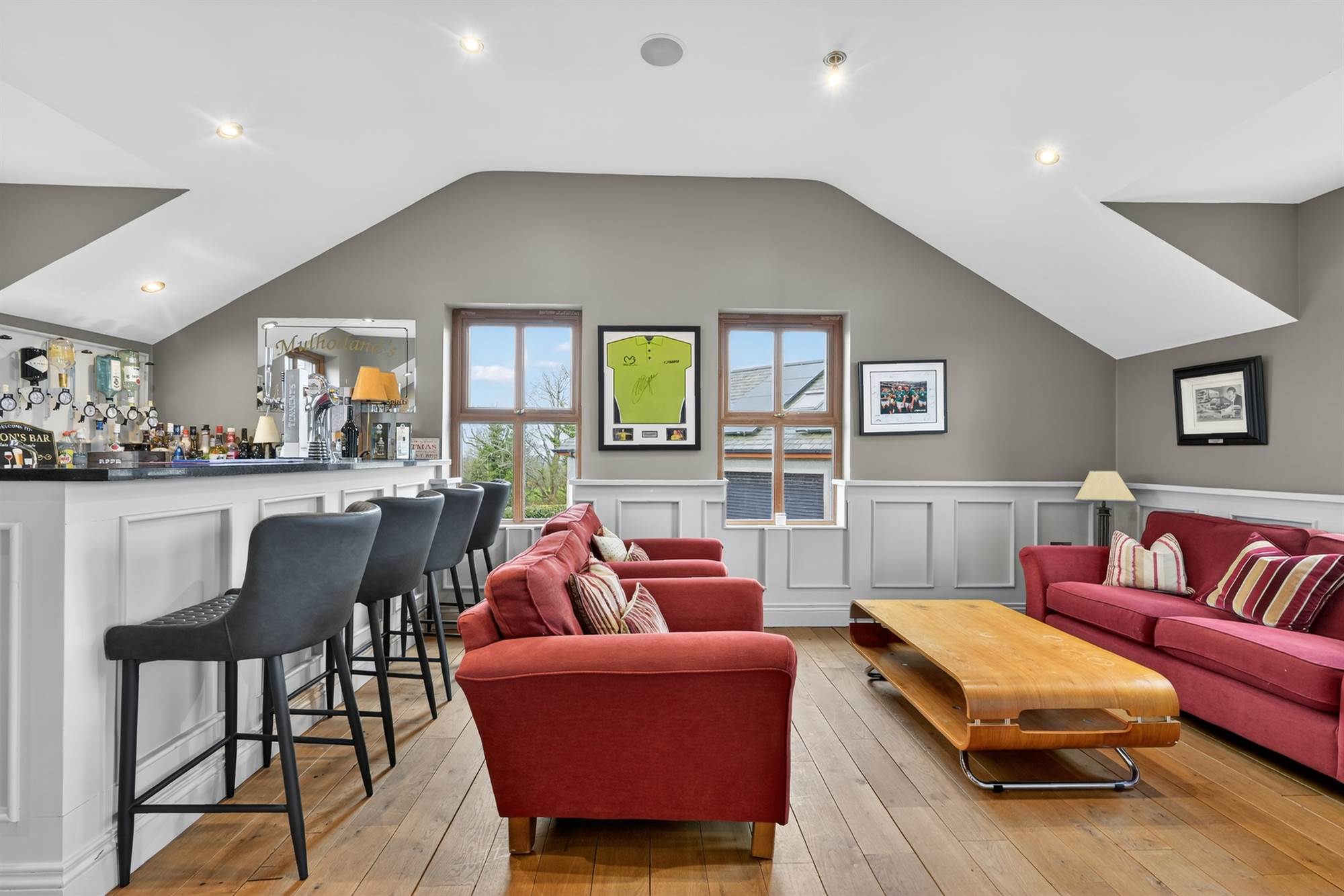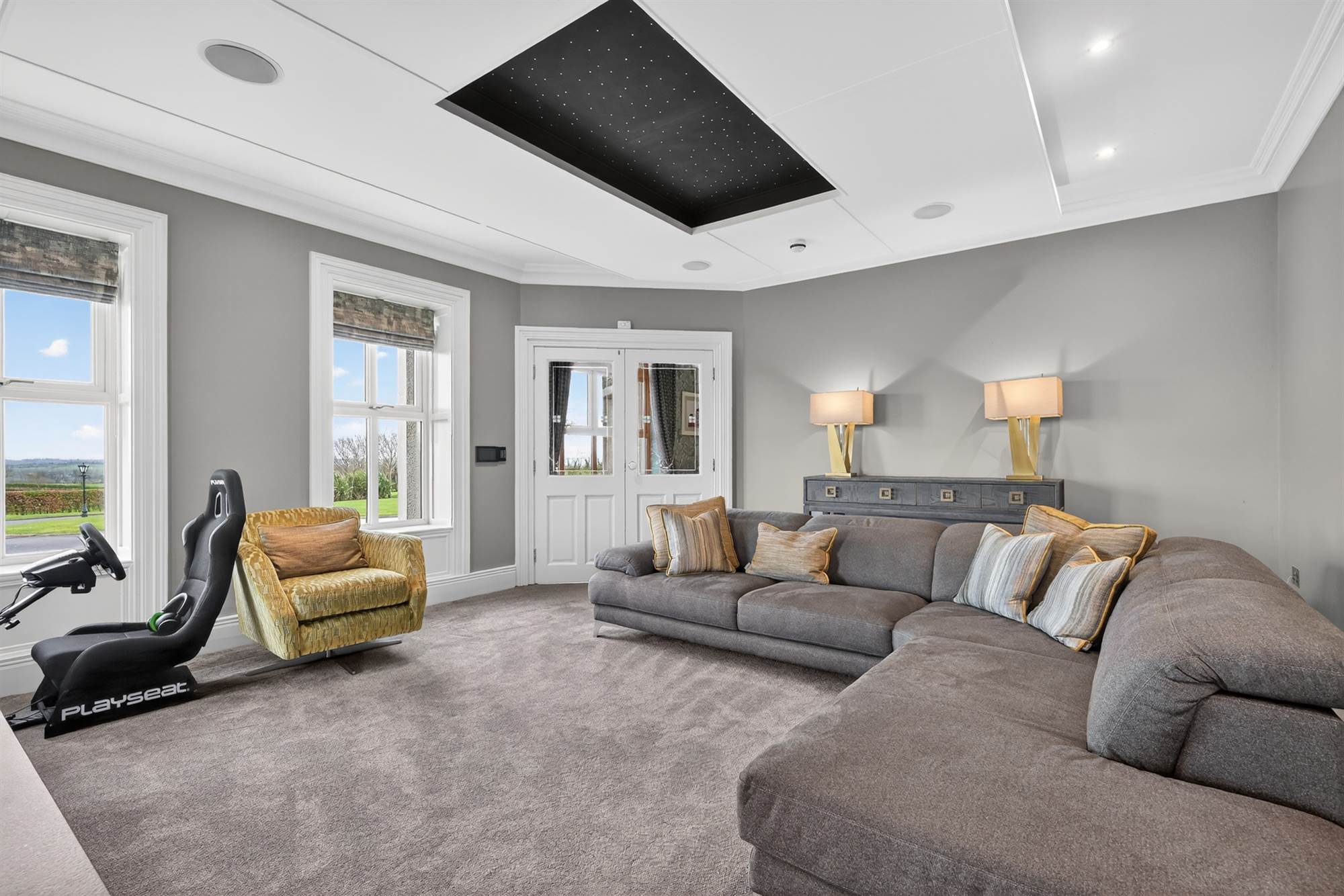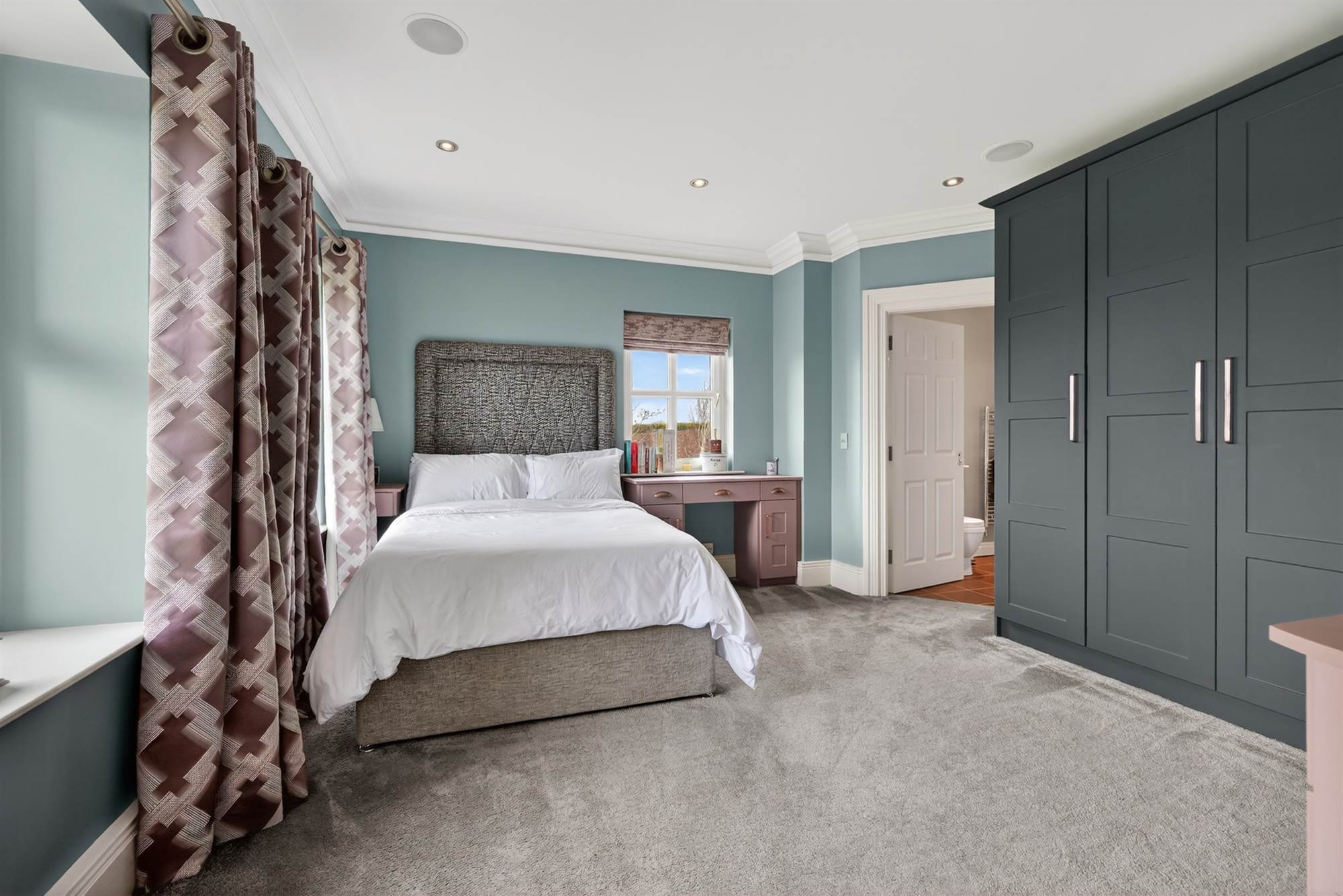 Timber balcony with stunning Co.Down views, cornice ceiling, low voltage spotlighting, built in TV unit, headboard and side tables.