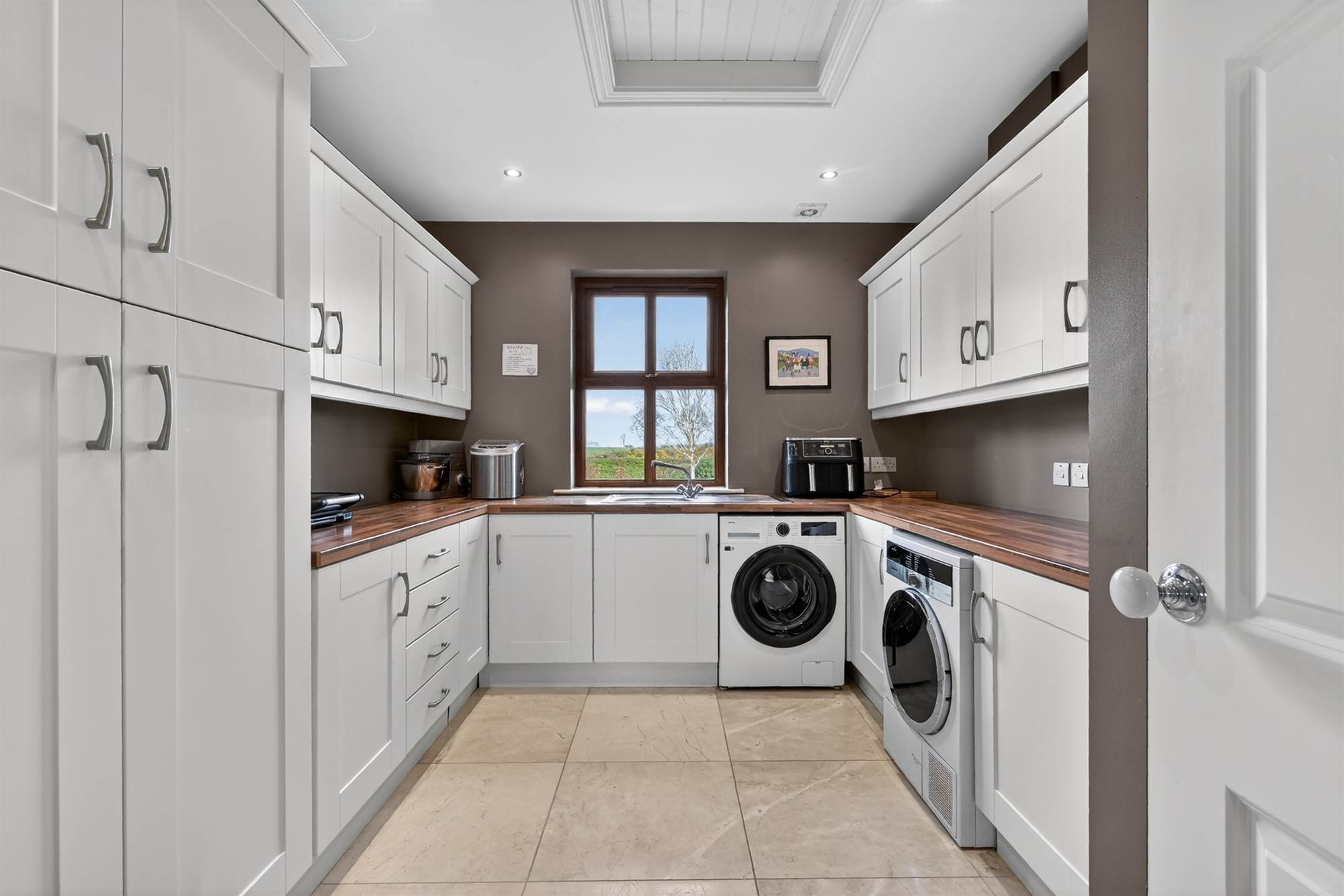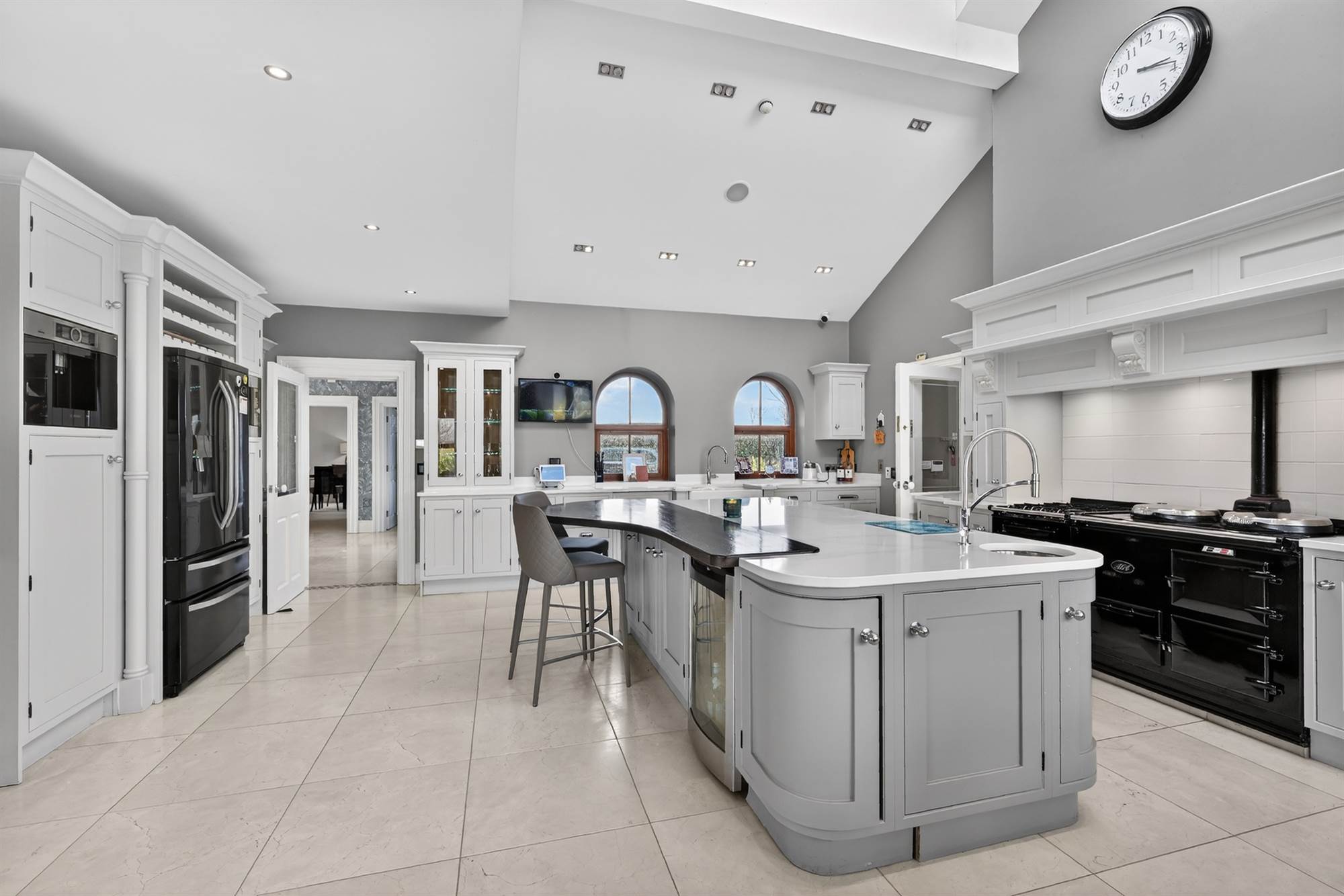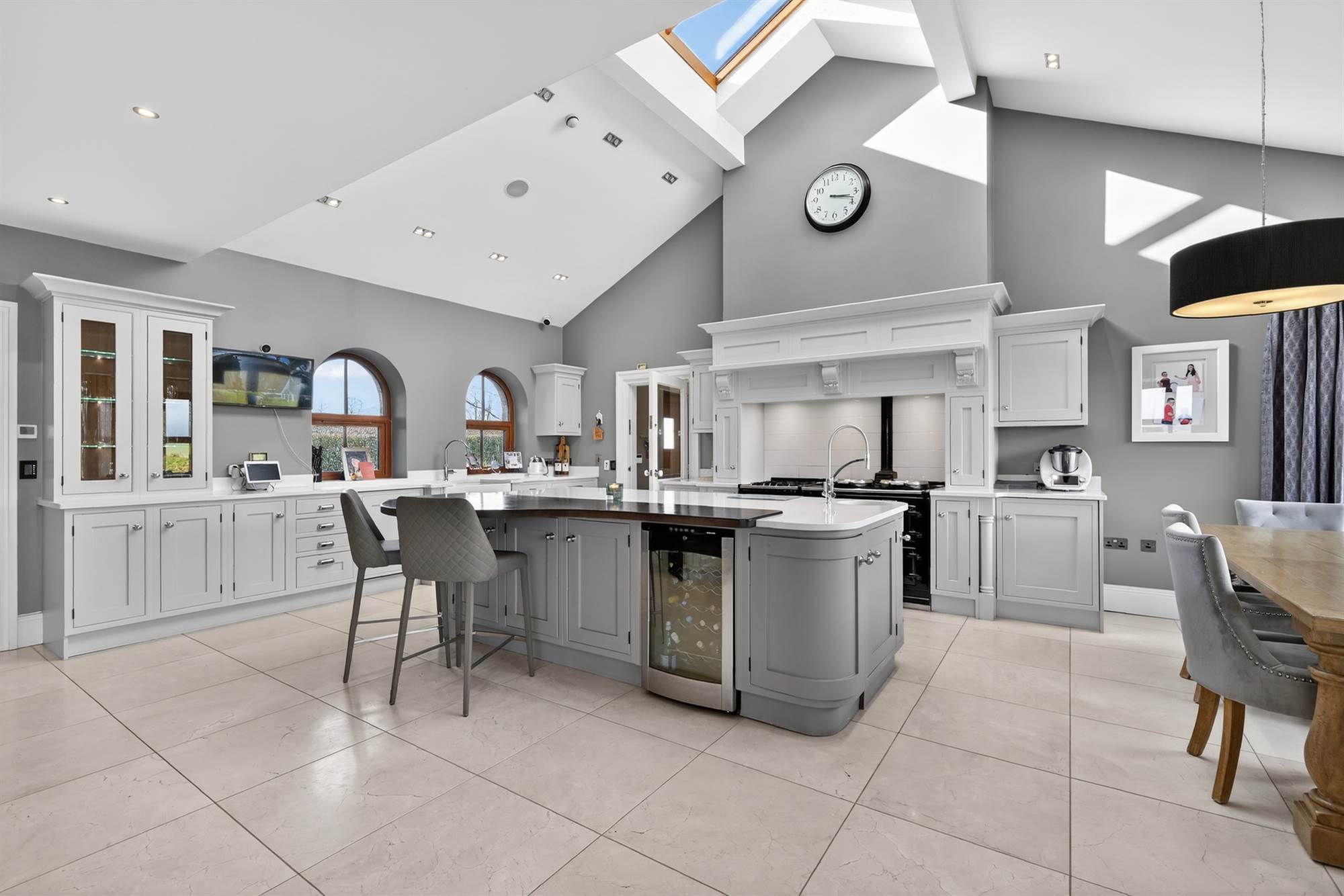 Hand painted range of high and low level units, granite work surface and drainer, twin old Belfast style sinks, integrated Neff dishwasher, Aga cooker with 4 ring gas hob, integrated Caple microwave, american fridge/freezer, twin pull out larder cupboard, integrated Bosch coffee machine, glazed display cabinet, large island with integrated washing machine, granite and walnut work surface, circular stainless steel sink, pull out veg baskets, part tiled walls, Porcelain tiled floor, vaulted ceiling,wood burning stove with granite hearth, low voltage spotlights.