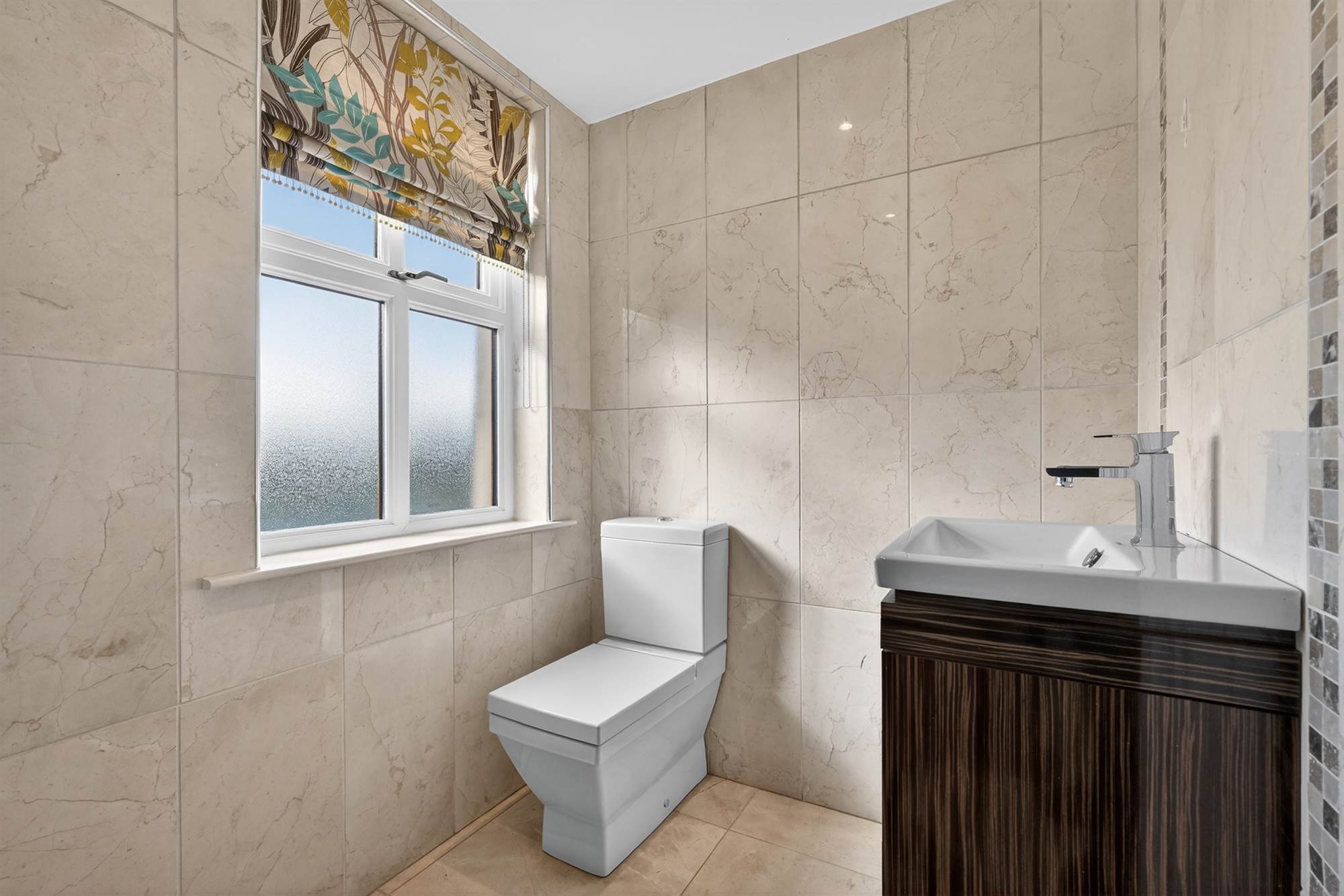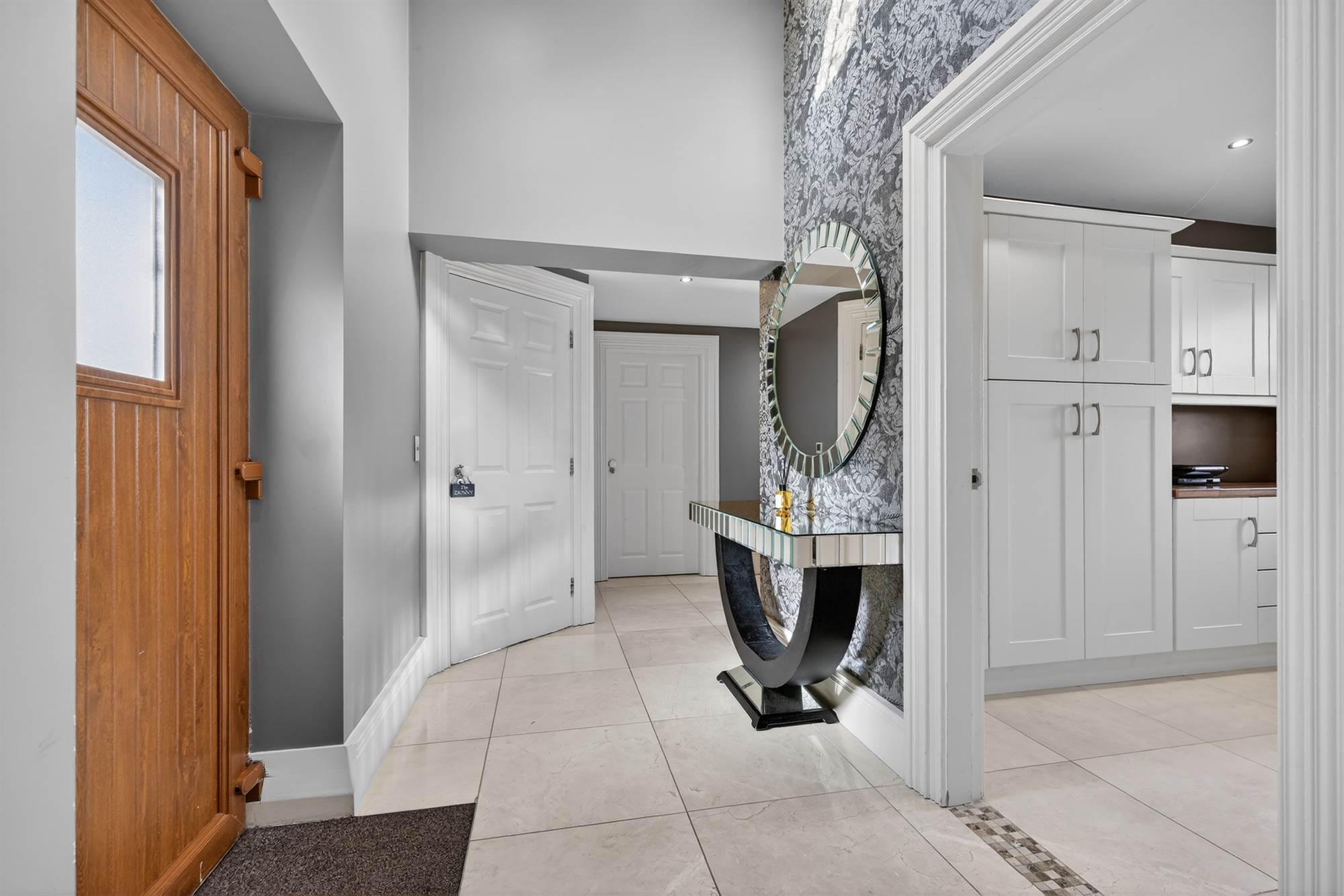 Porcelain tiled floor, low voltage spotlights, Velux window, service door to garage, door to rear.