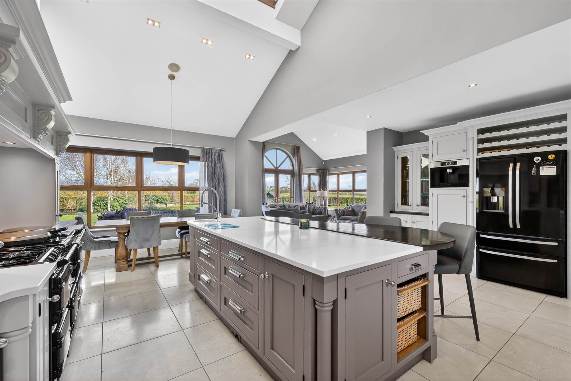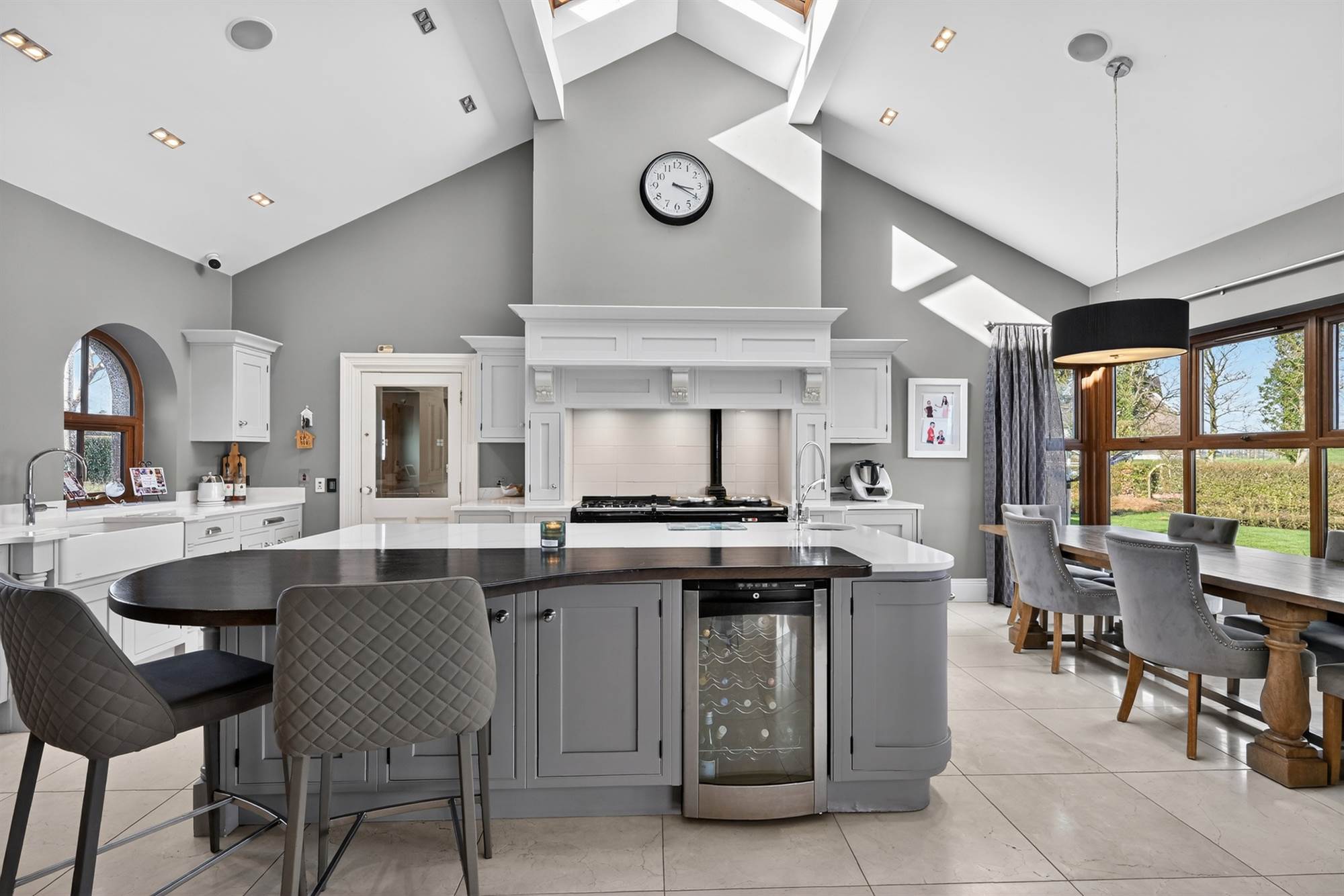 Entertainment Sized Modern Fitted Kitchen with Hand Painted Units and Granite Work Surfaces and Range of Integrated Appliances Open Plan to Dining Room and Living Room with Wood Burner