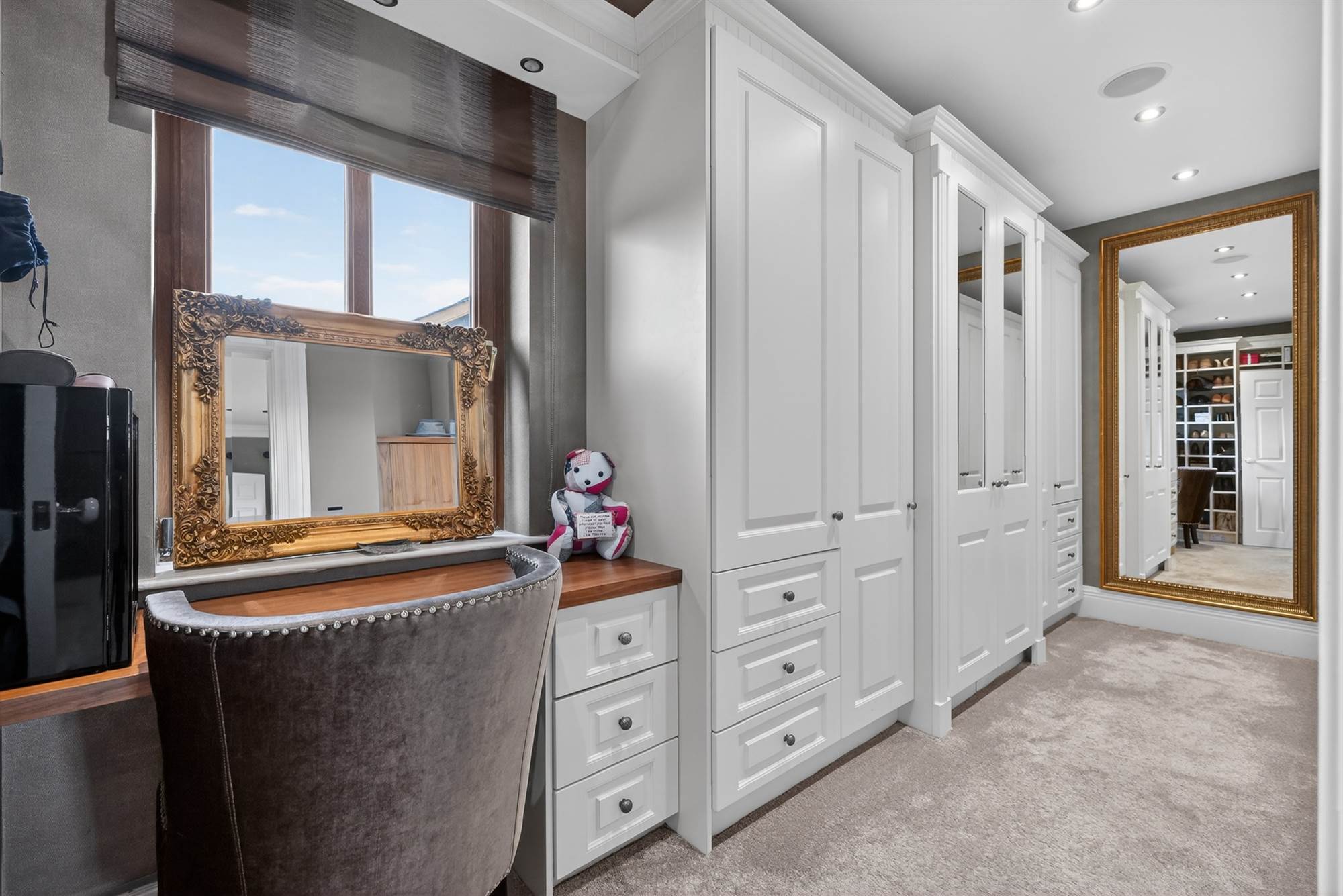 Bespoke range of his and her built in robes, drawers and shoe storage, dressing table, low voltage spotlighing.