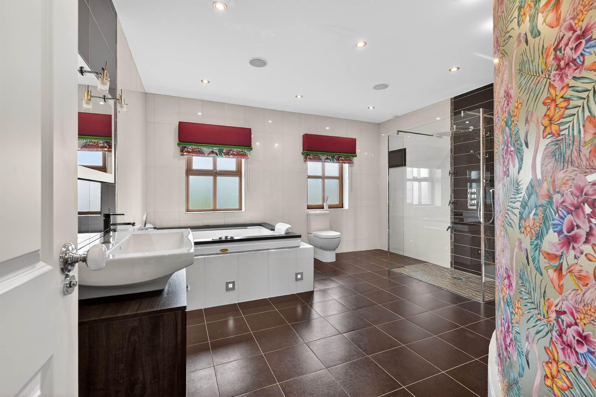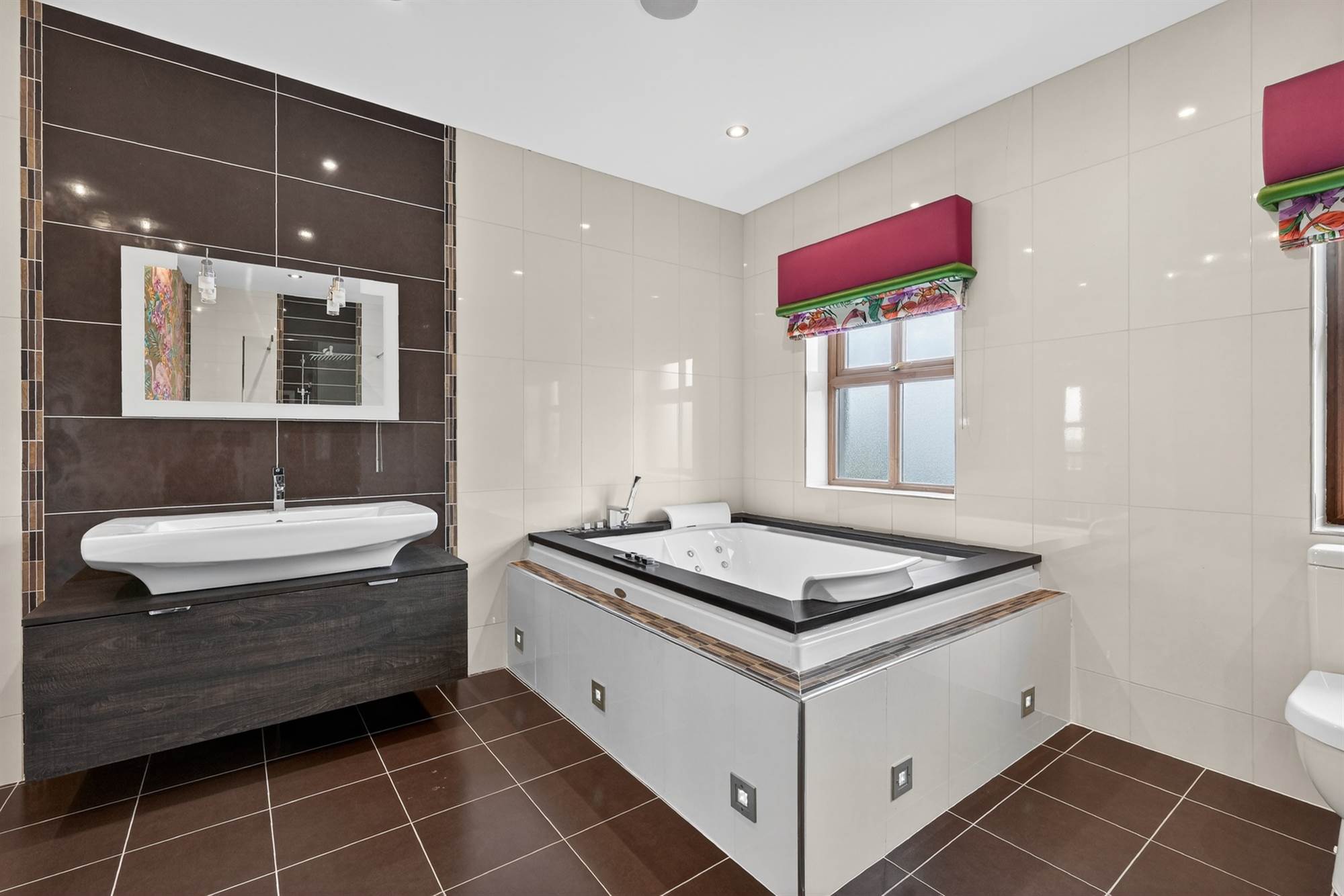 White suite comprising low flush WC, large vanity unit with feature wash hand basin, large fully tiled shower cubicle with drencher shower and jets, sunken bath with jacuzzi jets, inset tiling, ceramic tiled floor, low voltage spotlighting, heated towel rail, circular wall.