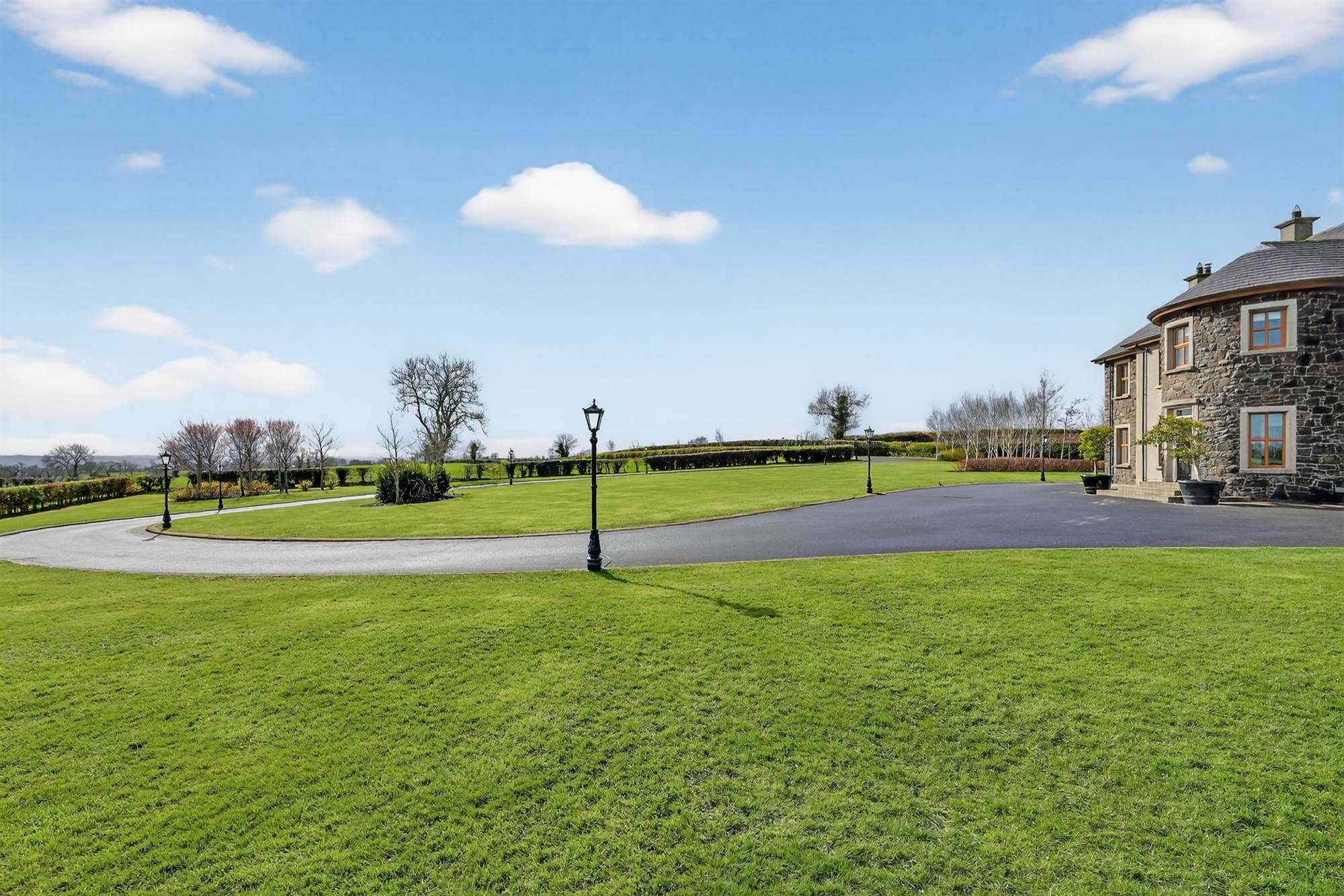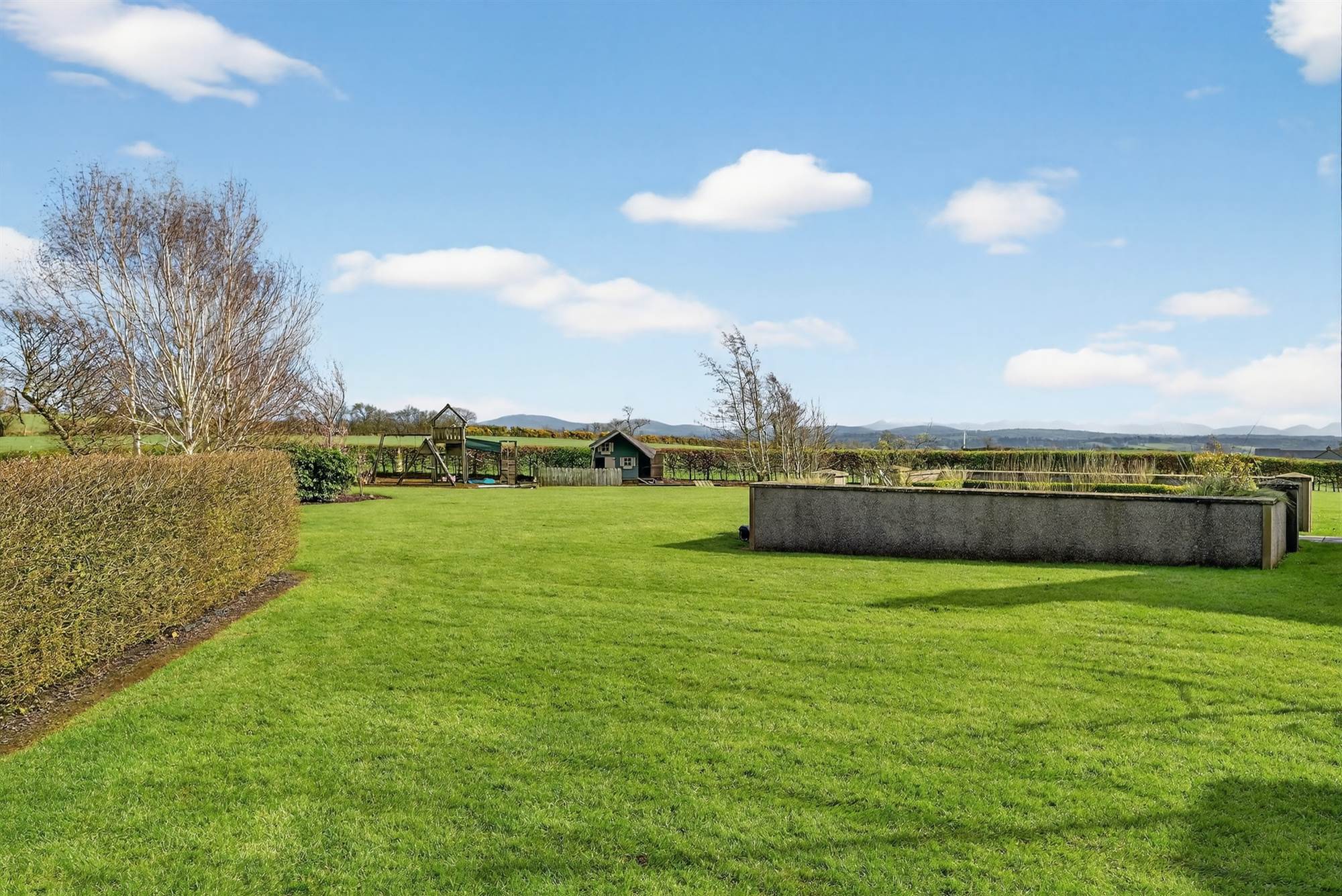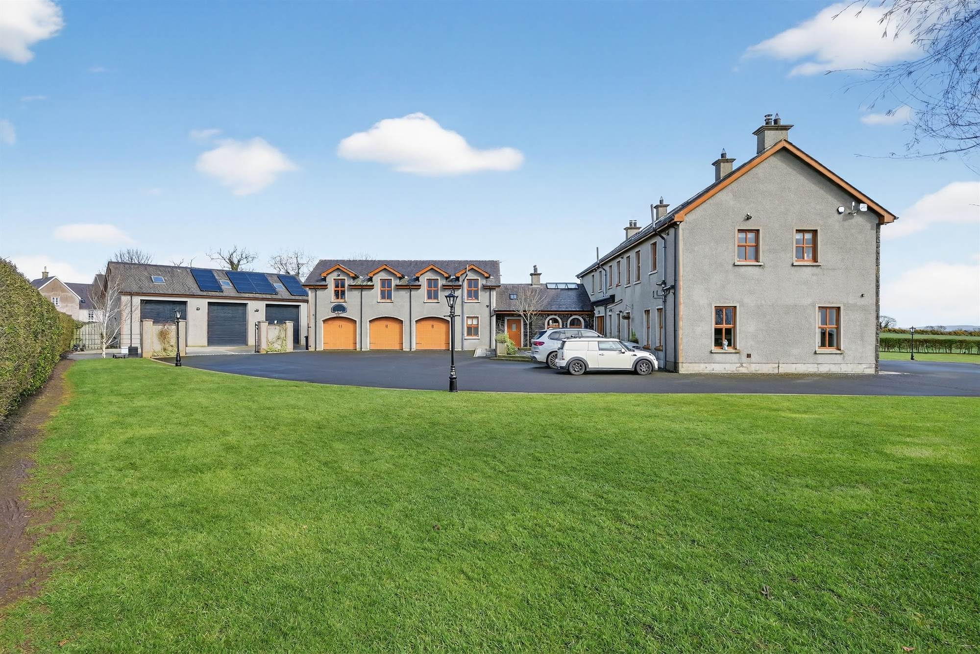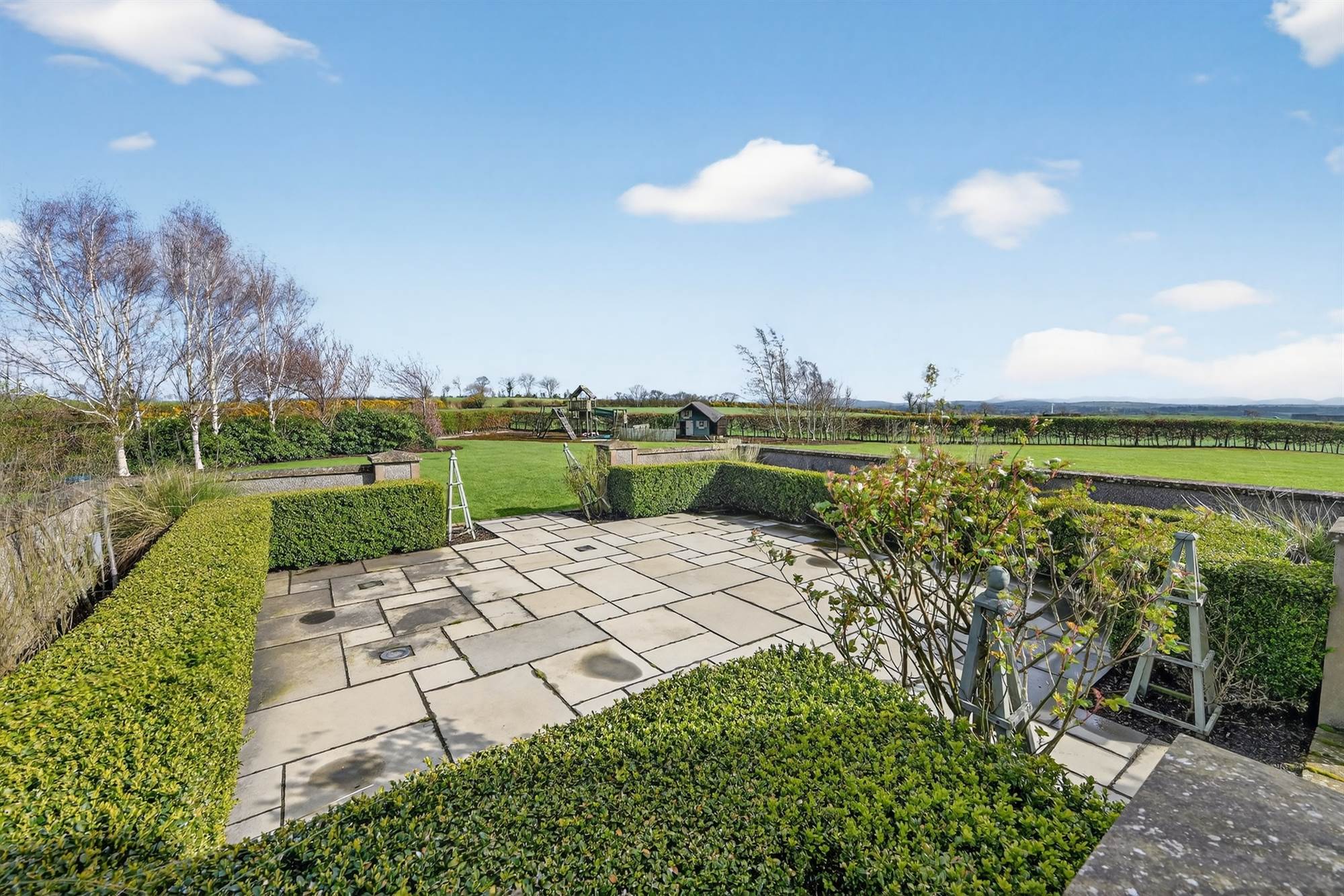 Electric entrance gates with sweaping hedge lined driveway with parking and turning areas for several cars, feature street lighting, excellent surrounding lawns with stone paved patio which is secluded and private. Play area with kids play and summer house. Landscaped beds in bushes and trees.