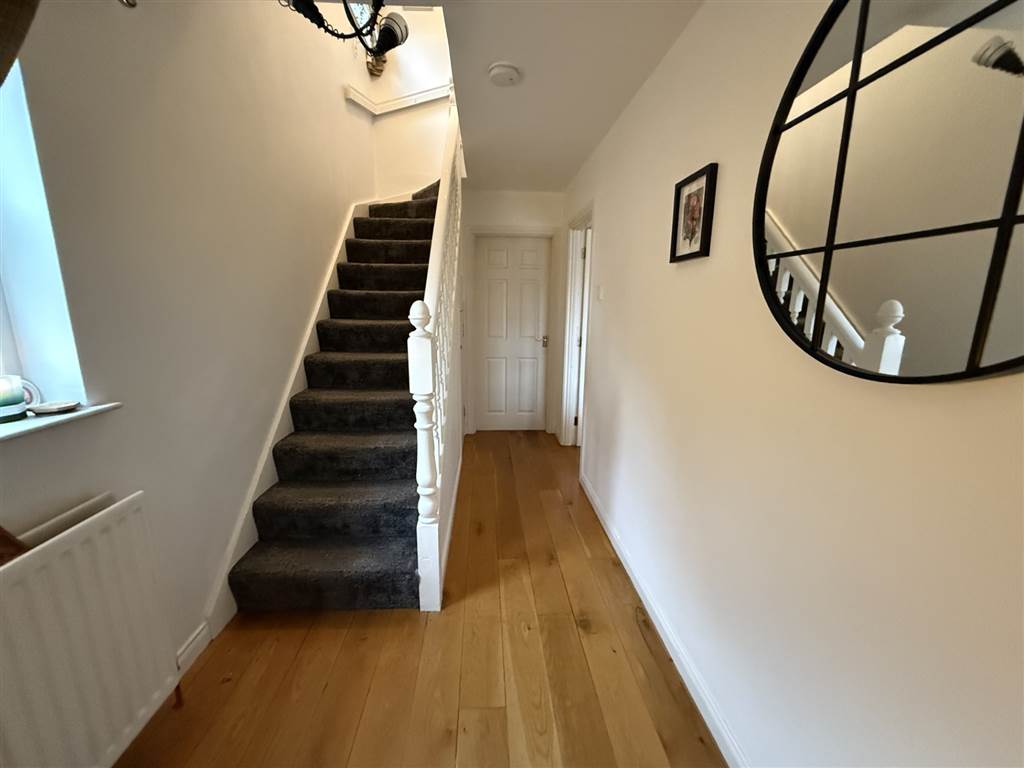 Part glazed front door. Solid wood flooring. Built-in storage under stairs.