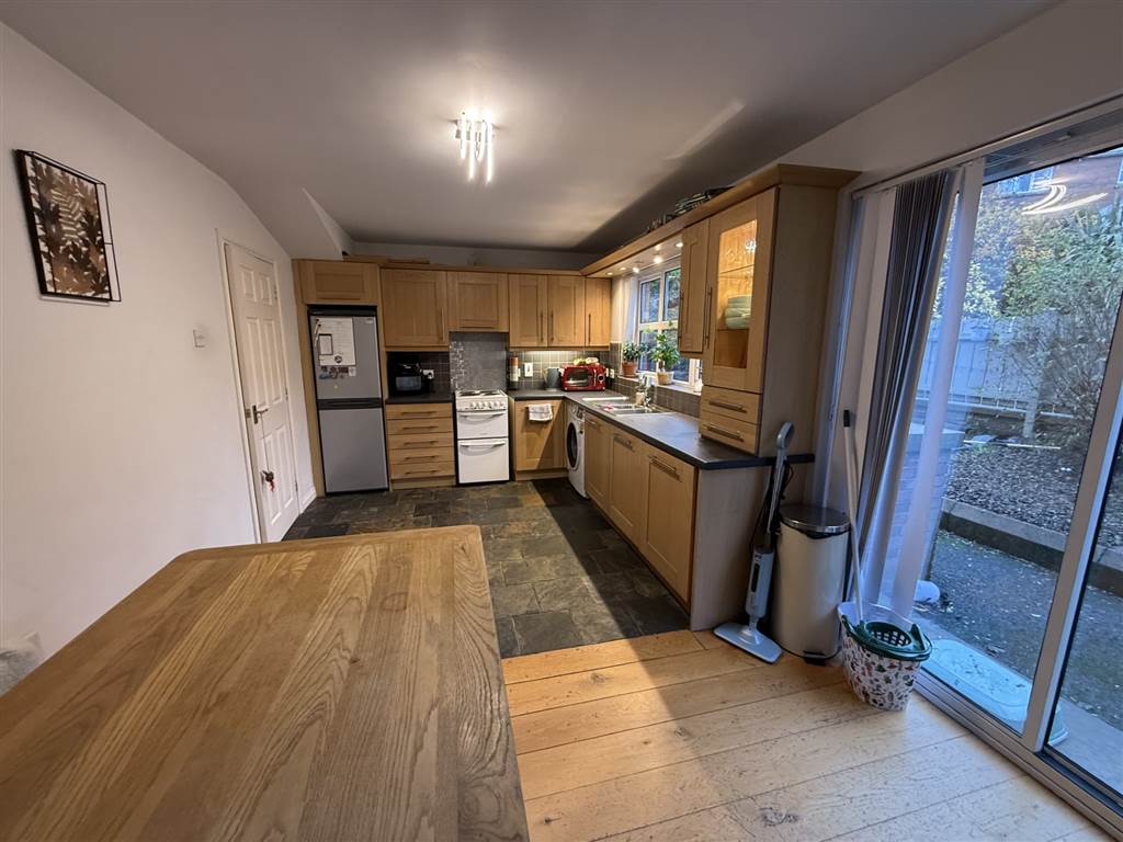 Range of high and low level shaker style units with contrasting granite effect worktop. One and a half stainless steel sink unit with mixer tap and drainer. Space for cooker with concealed extractor over. Plumbed for washing machine. Integrated dishwasher. Space for fridge/freezer. Glazed display unit. Lit pelmet. Rustic slate tile in kitchen area. Tiled between units. Solid wood flooring to dining area. Sliding double glazed door to rear.