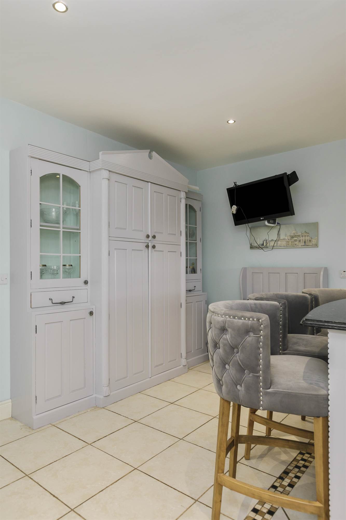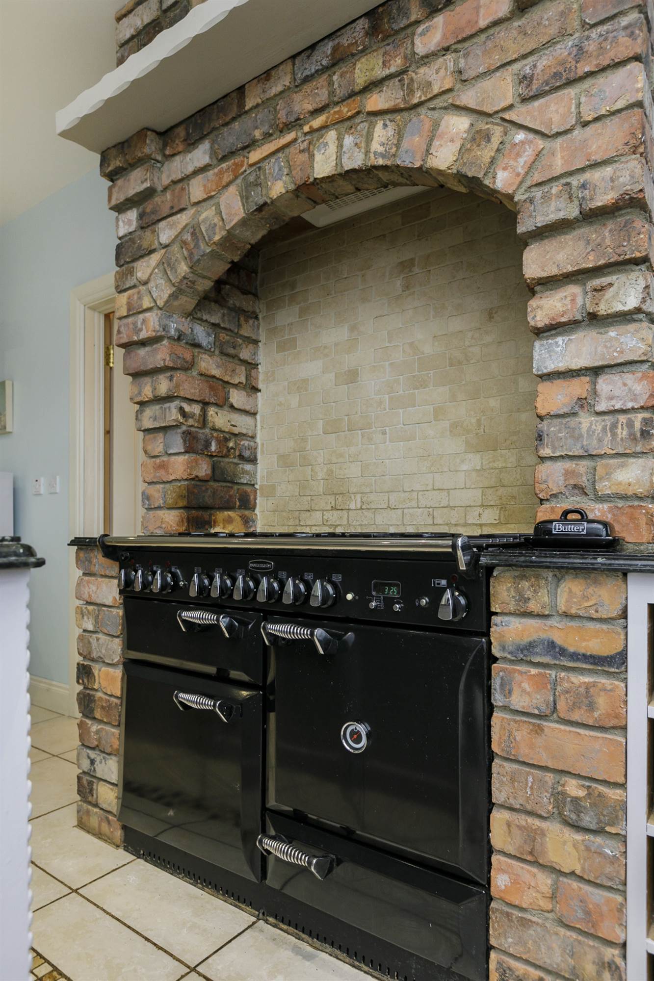 Range of high and low level units. Granite work surfaces. Central island unit with circular inset sink. Twin old Belfast sink units. Rangemaster. Double oven. 6 ring hob with brick surround and stone splashback. Integrated dishwasher. Ceramic tiled floor.
