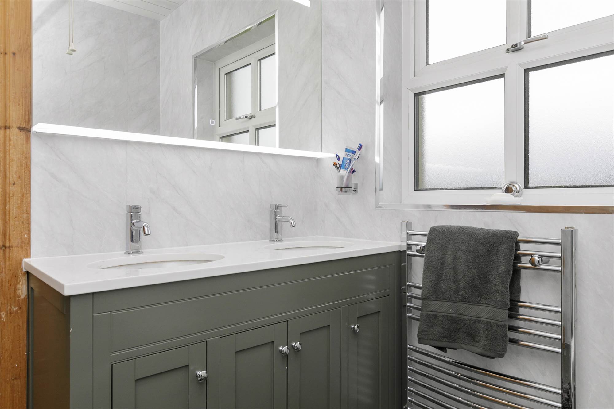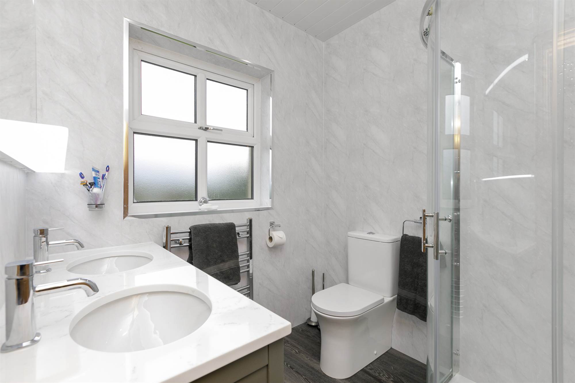 Double shower with rainhead attachment. Low flush WC. Twin pedestal wash hand basins with vanity units. Chrome heated towel rail. Low voltage spotlighting.