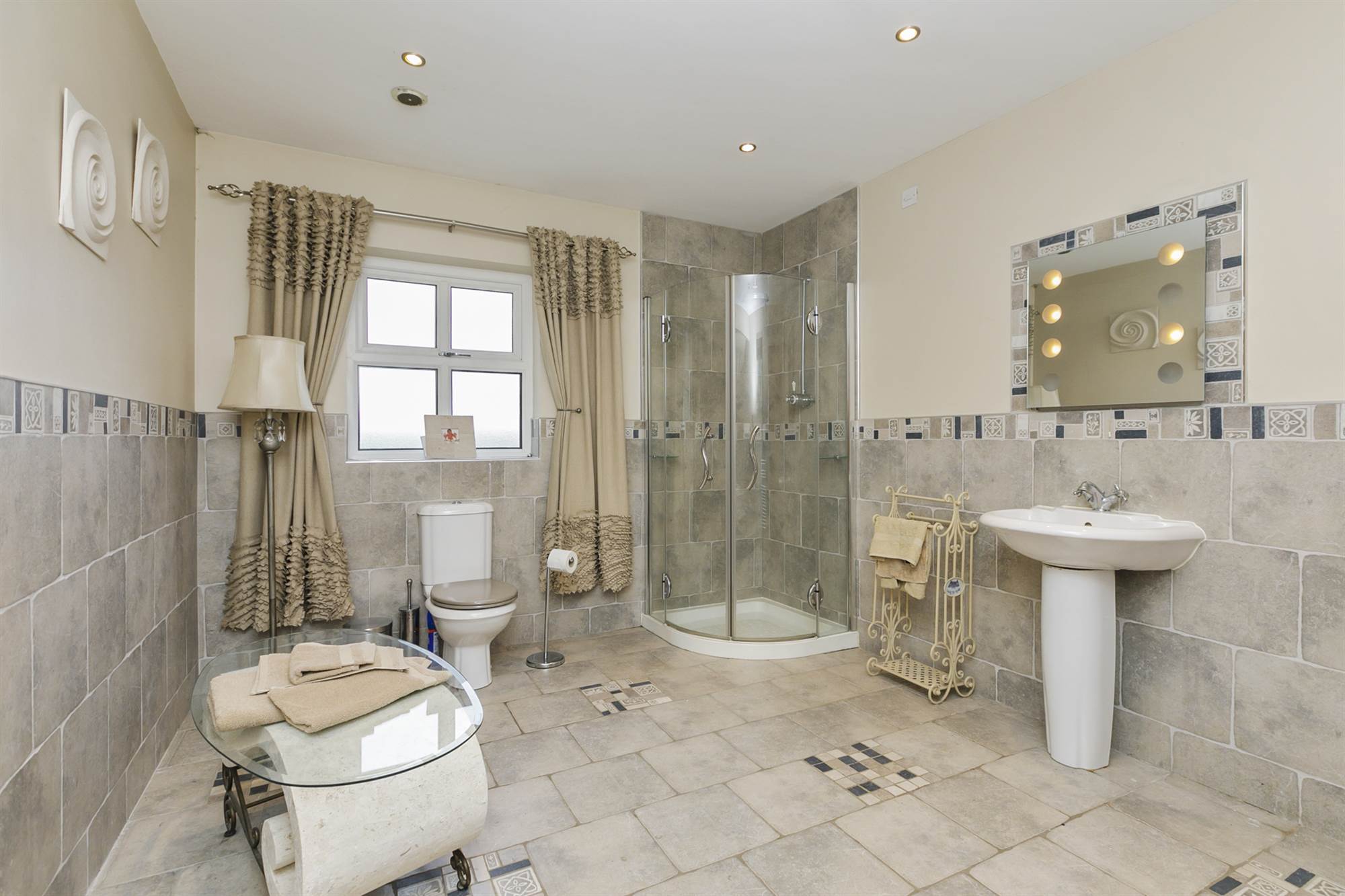 Low flush WC. Pedestal wash hand basin. Inset circular jacuzzi type bath. Fully tiled corner shower cubicle. Partially tiled walls. Chrome heated towel rail. Ceramic tiled floor. Low voltage spotlighting.