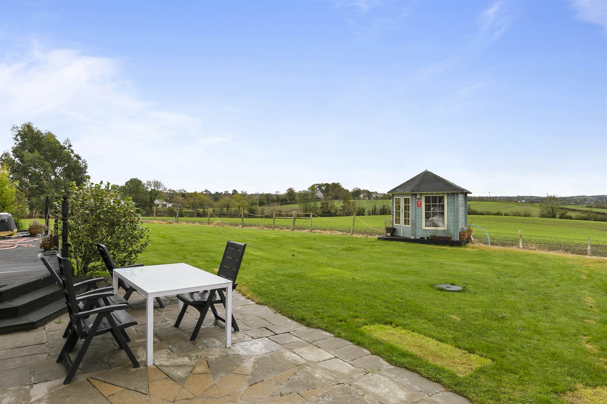 Twin concrete pillars to stone driveway with garden in lawns all around the property with a selection of plants and shrubs. Paved sitting area with wonderful views overlooking the countryside and raised timber decked sitting area.