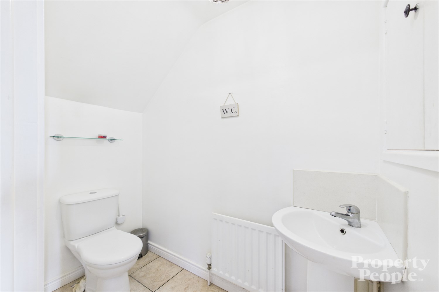 Downstairs W.C with low flush WC, wash hand basin with pedestal, tile splashback, tiled floor and single panel radiator.