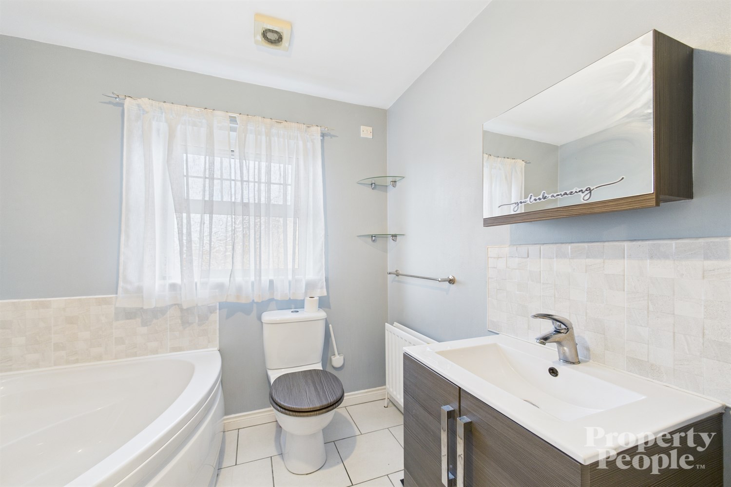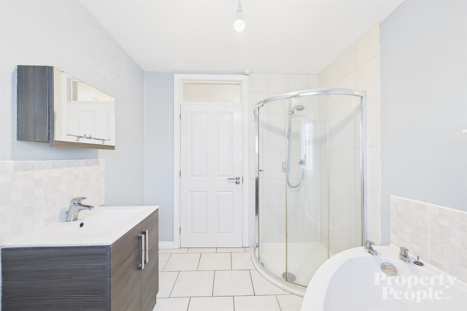 Modern family bathroom with an enclosed corner shower unit, low flush WC, wash hand basin with vanity unit and tiled splashback, tub bath with tiled splash back surround, tiled floor, panelled radiator and extractor fan.