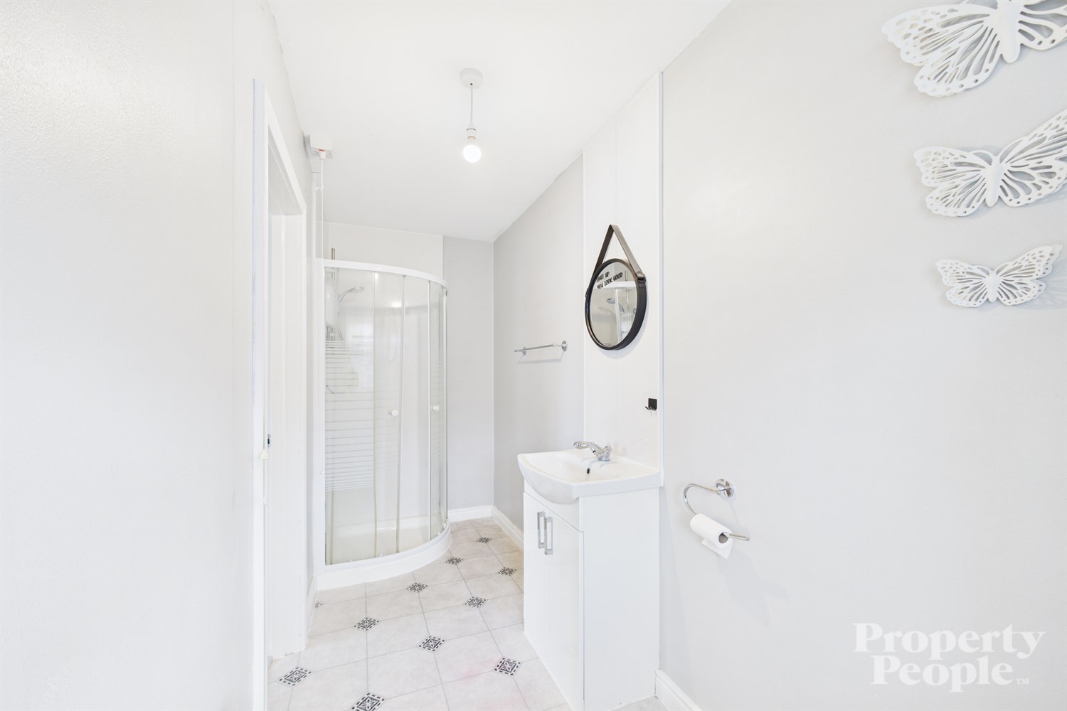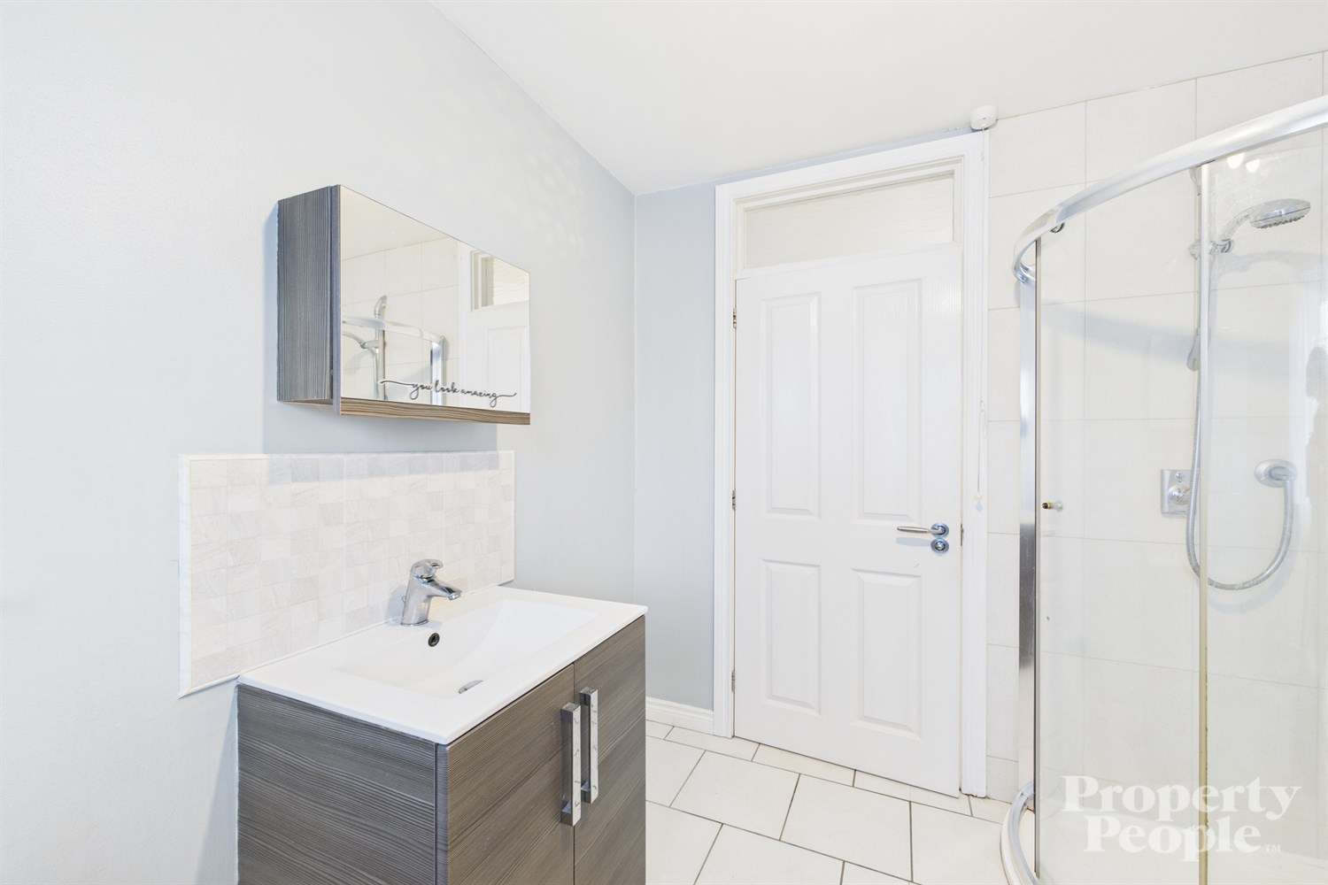 Modern ensuite shower room with an enclosed shower unit with electric shower, low flush WC, wash hand basin with vanity unit and splash back, tile effect floor, double paneled radiator.