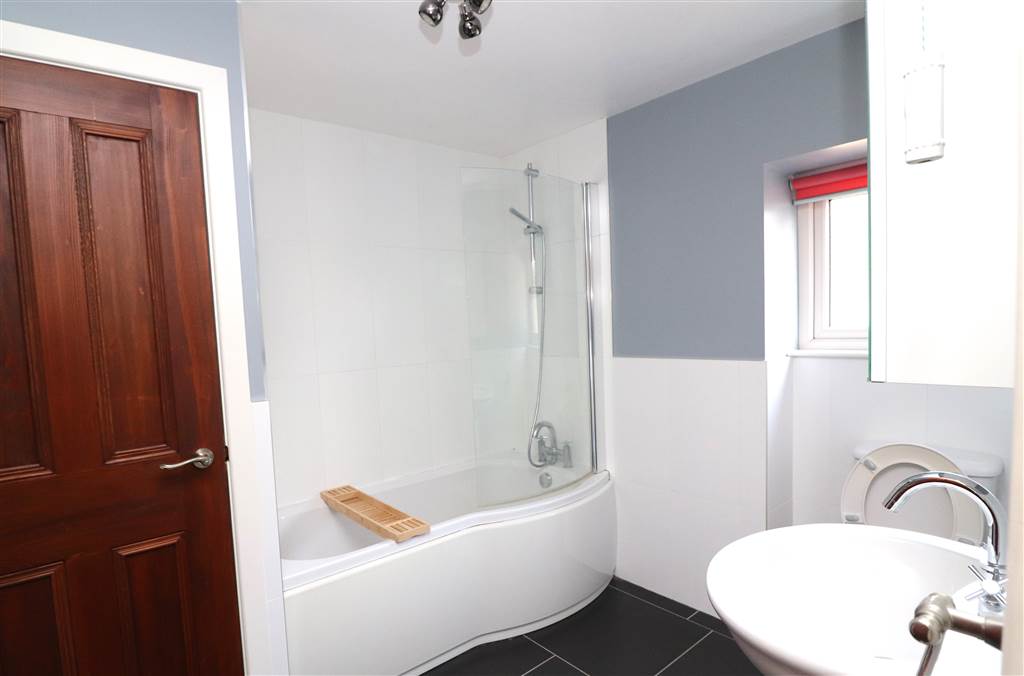 Modern Family Bathroom with White Suite Comprising WC, Bath with Shower Over and Wash Hand Basin
