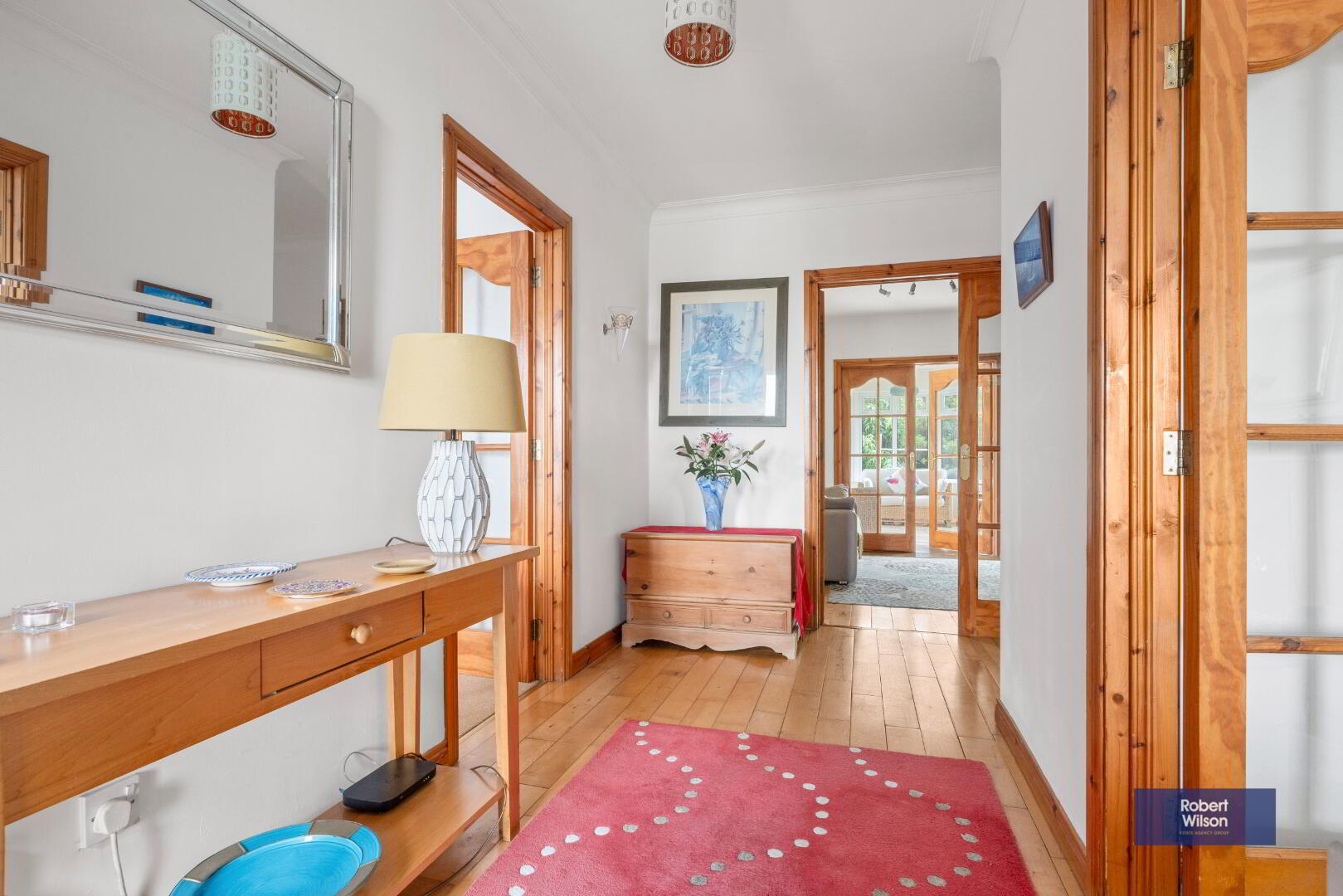 Hardwood front door with sidelight, solid wood floor, cloakroom off, hotpress off, single panel radiator, double panel radiator.