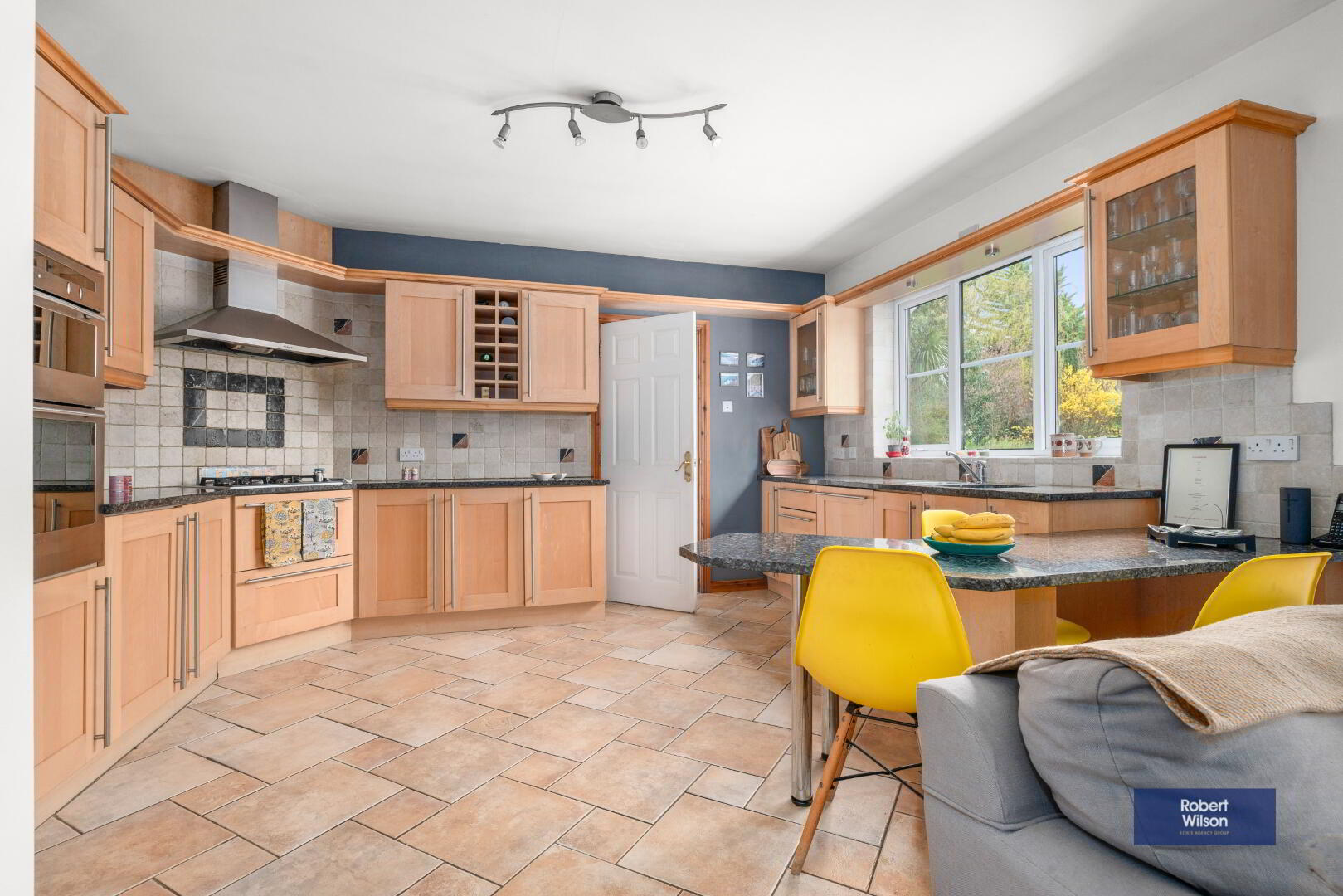 3.27m x 6.96m (10' 9" x 22' 10") Good range of high and low level units with granite worktop, 4 ring gas hob, eye level double oven, inset sink unit, integrated dishwasher, integrated fridge freezer, part tiled walls, tiled floor.
