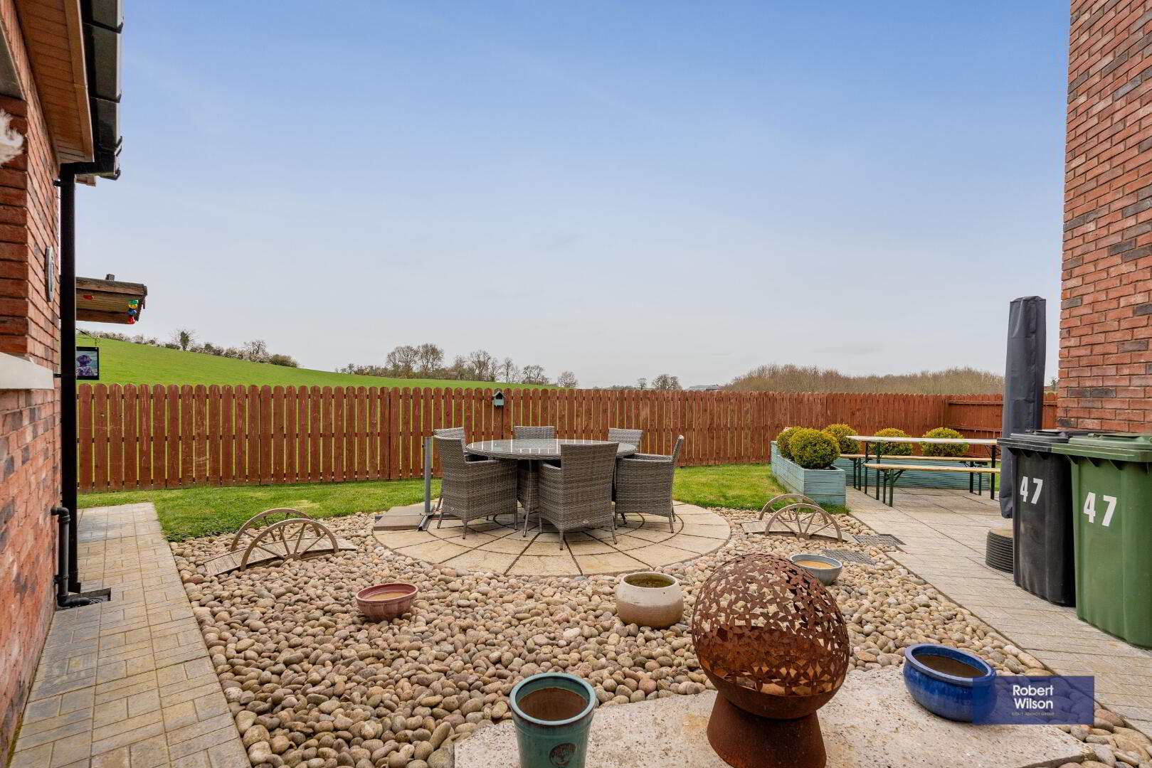 Spacious private site with beautiful views over the open countryside. completely enclosed. Paved patio with additional circular patio feature. Outside tap, oil tank. Side gate to front and access to garage.