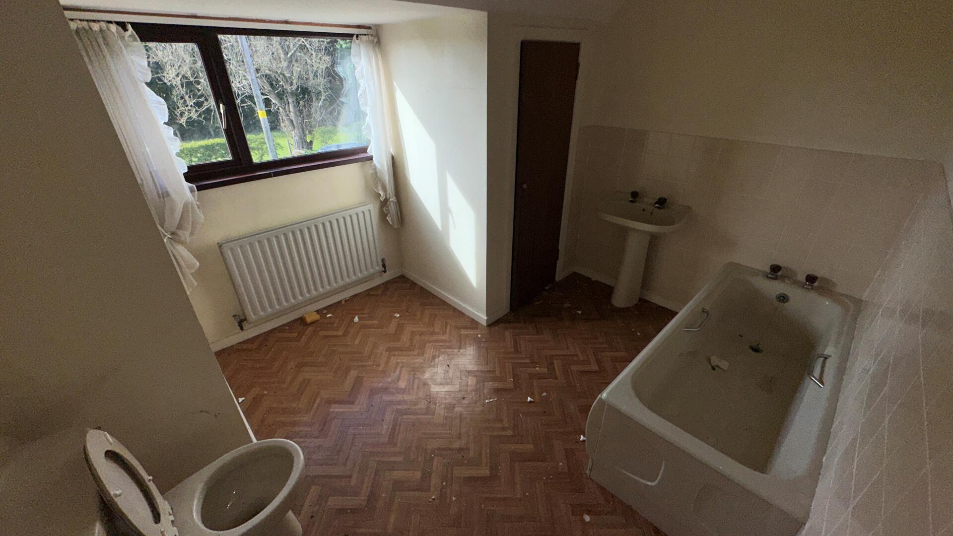 Champagne suite comprising bath wc and wash hand basin. Partly tiled walls. 1 double panel radiator.