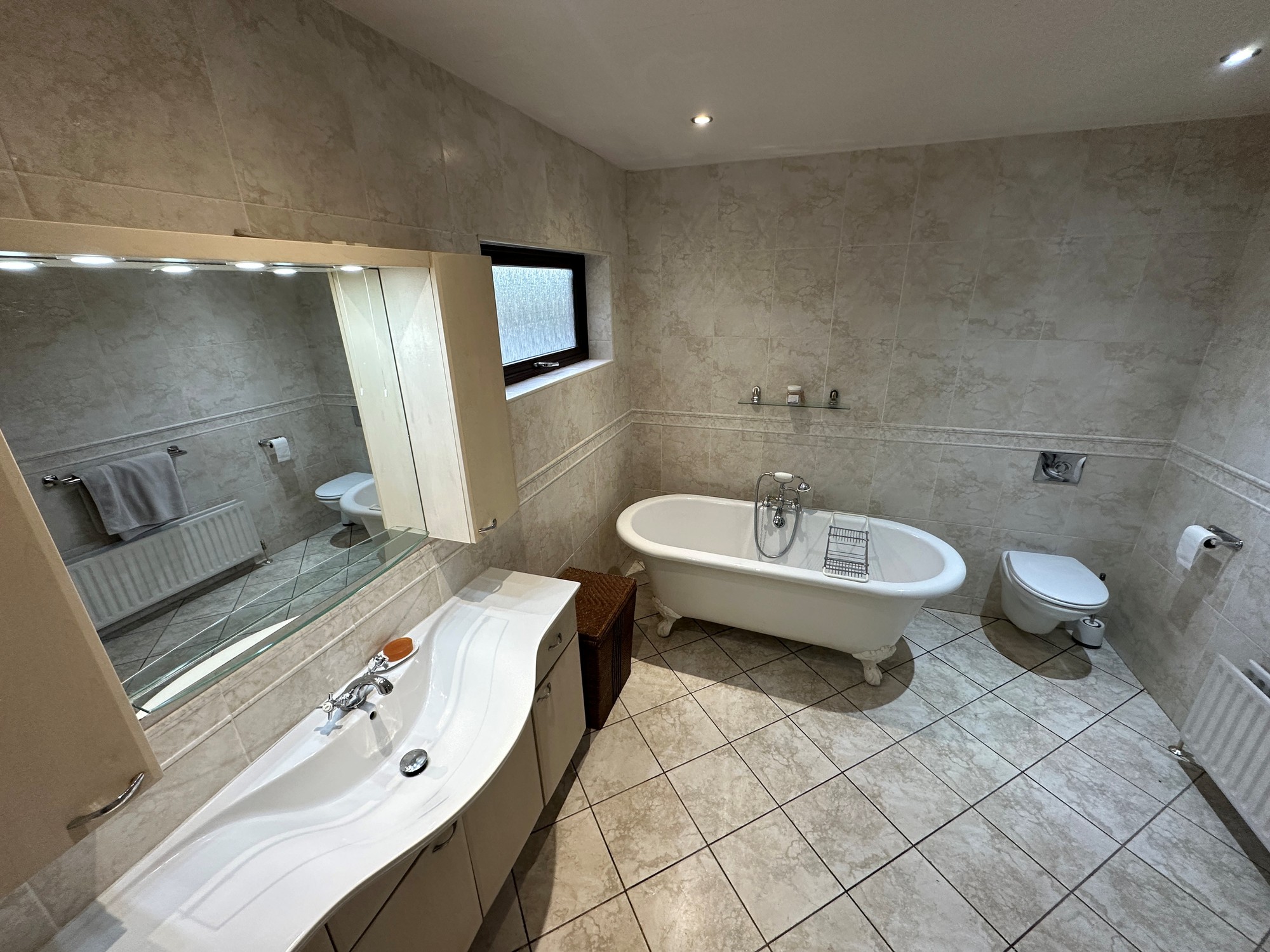 White suite comprising free standing bath with side mixer taps. Vanity unit with wash hand basin. Shower cubicle with Crohe shower valve. Wall mounted wc. Fully tiled waslls. Tiled floor . Downlighters.