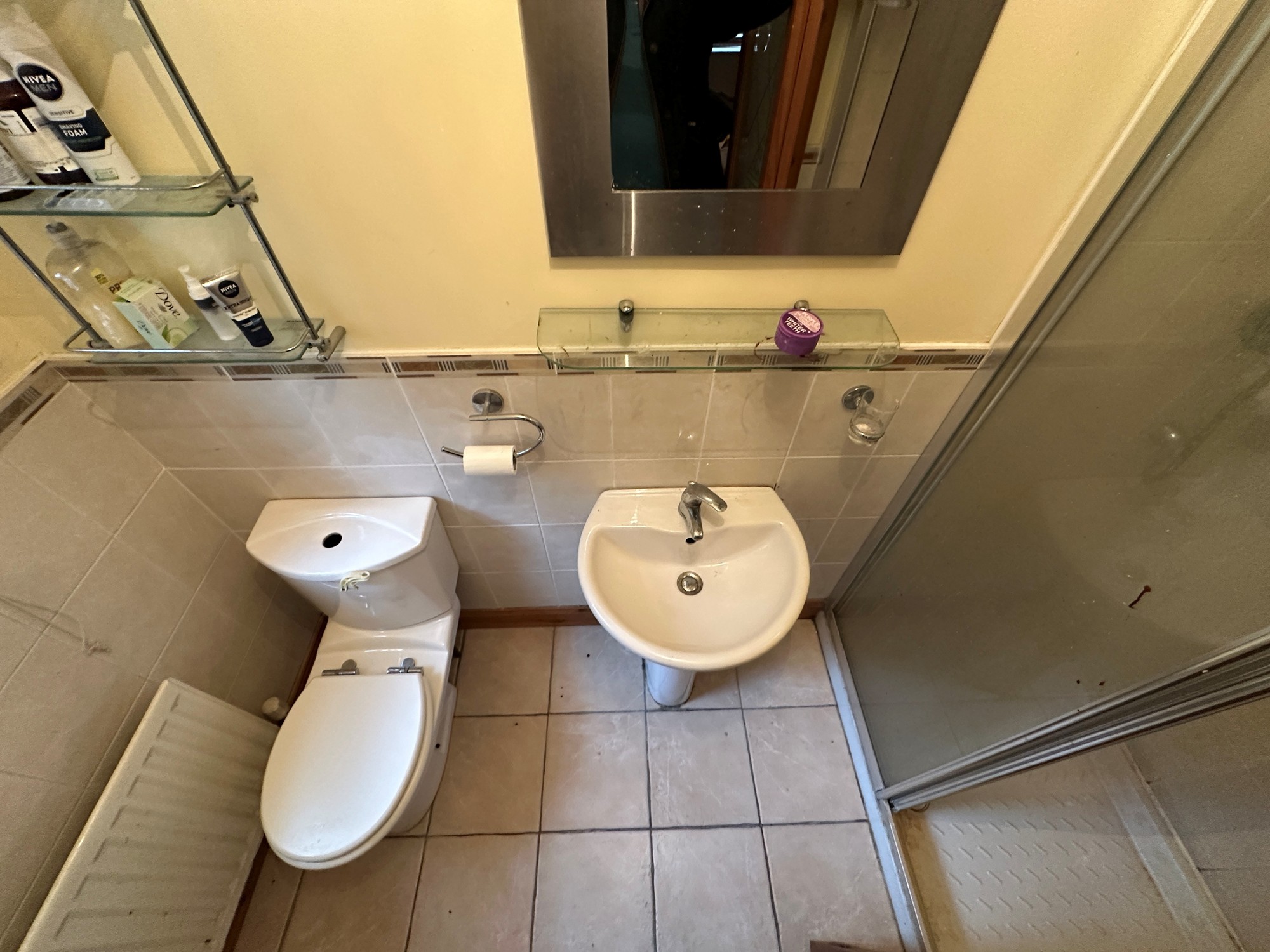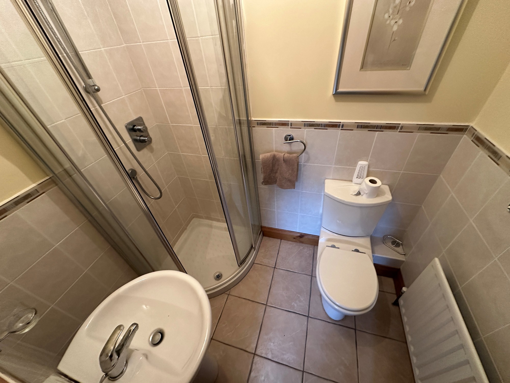 Tiled floor. Fully tiled shower cubicle. Pedestal wash hand basin with mixer tap. Low flush wc. Part tiled walls.