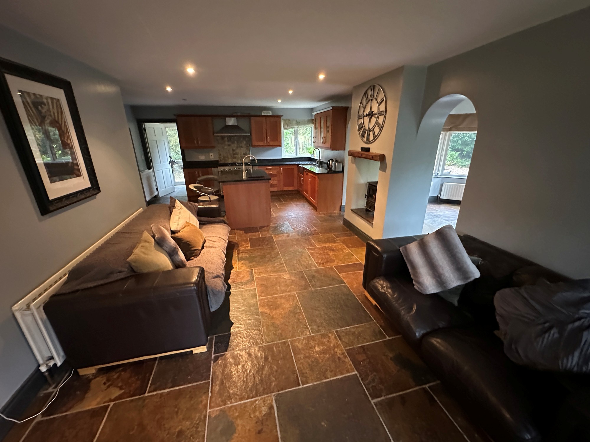 Range of shaker style cupboards in cherry. Granite worktops . Stainless steel sink unit with mixer tap. Integrated dishwasher . Range style cooker with extractor unit over in stainless steel. Matching island unit with breakfast. Cupboards and stainless steel sink unit with mixer tap. Log burning stove .