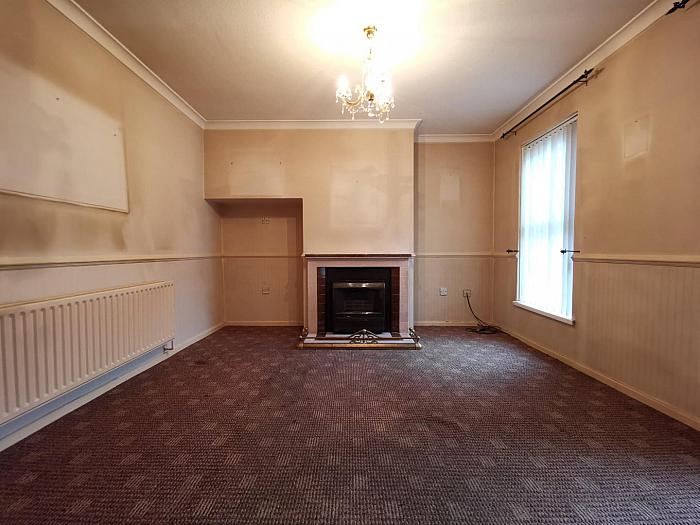 A spacious lounge with glass fronted fire, double radiator and carpeted floor.