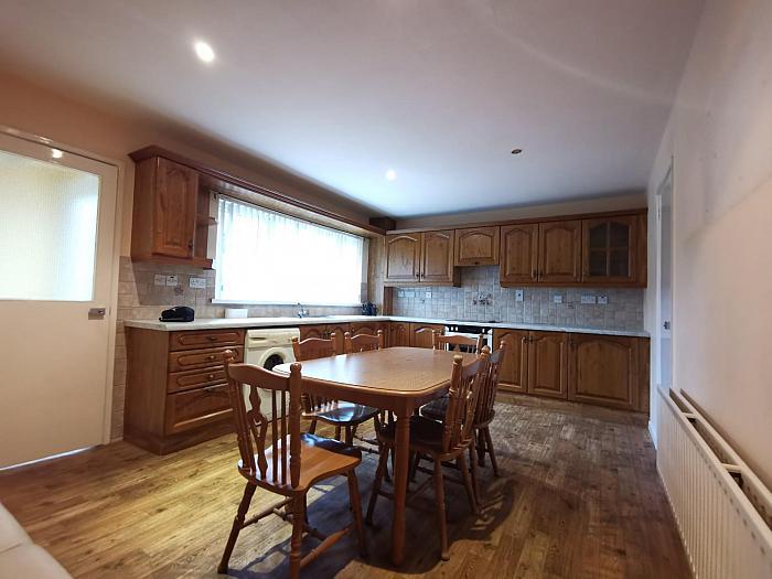 A large kitchen with plenty of oportunity to make it your own. There is plenty of space for a sofa and dining table and chairs.