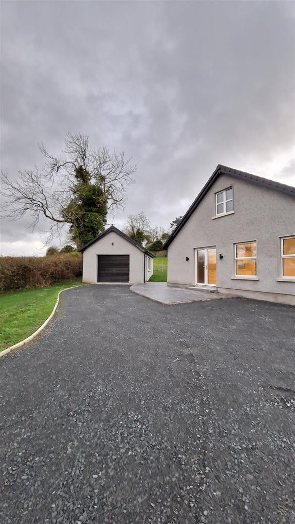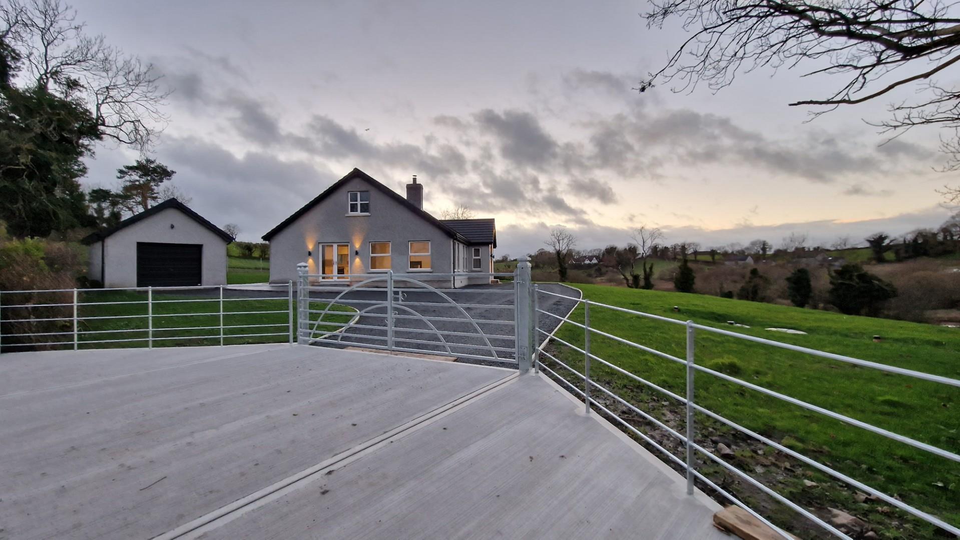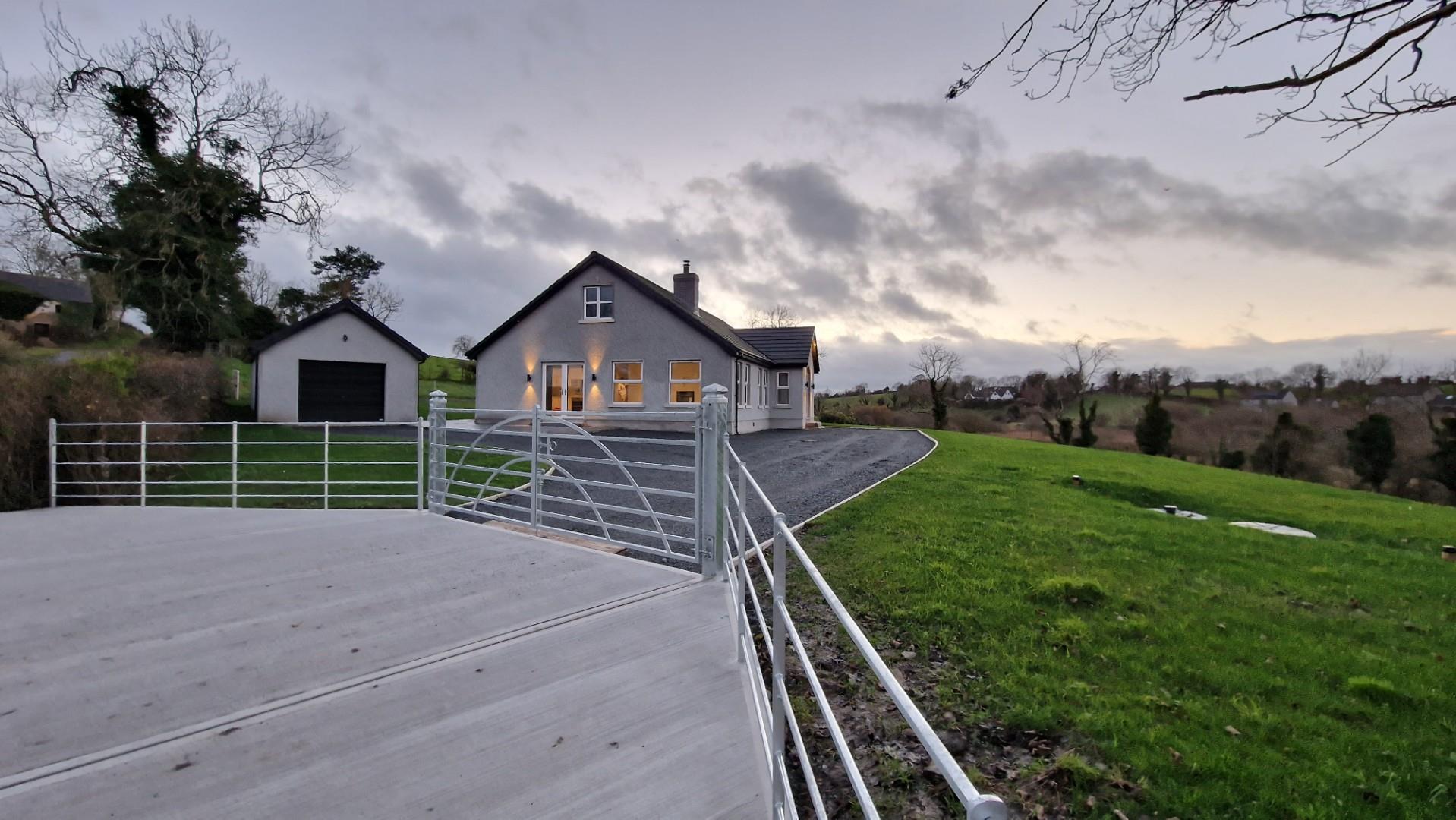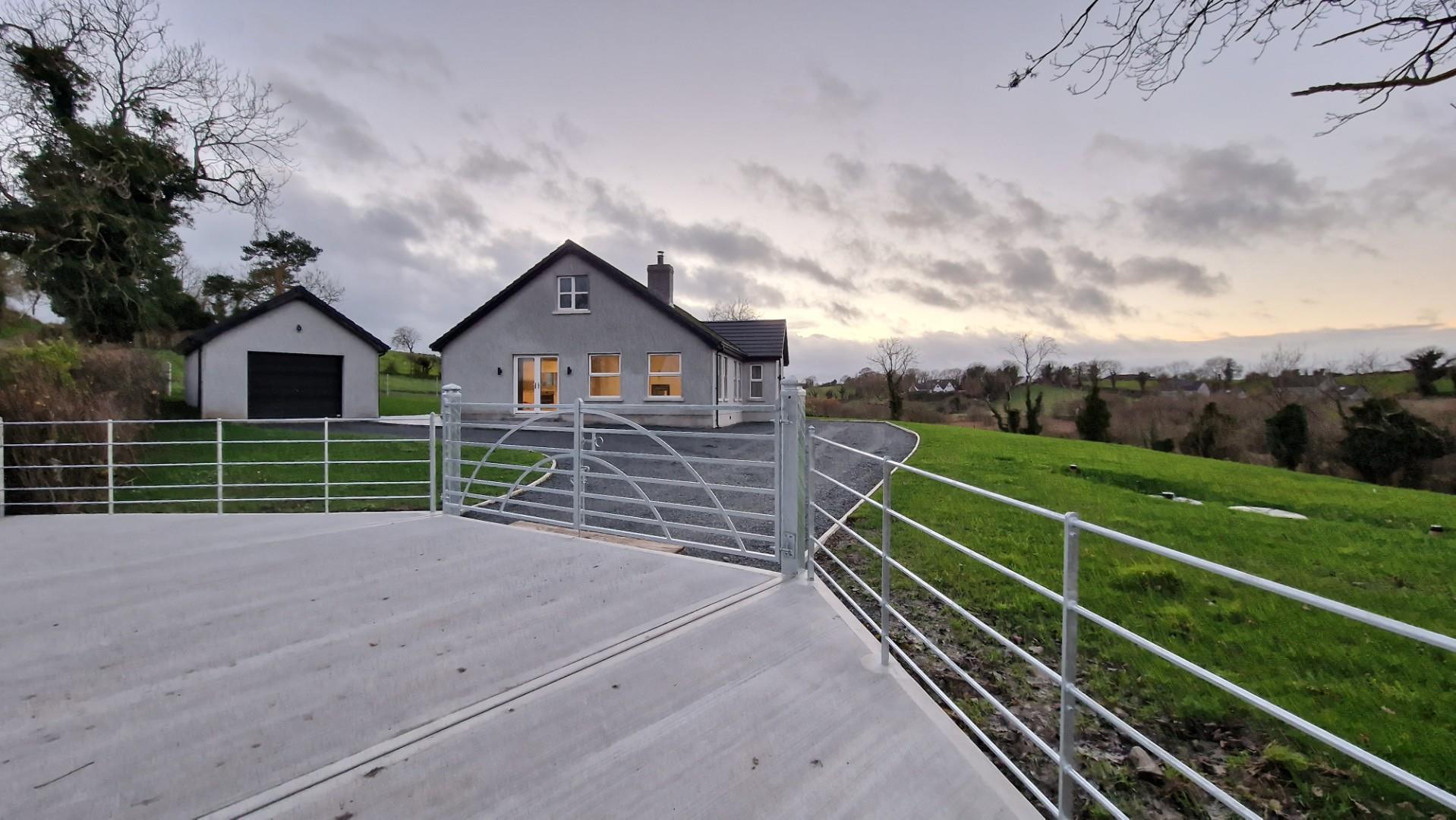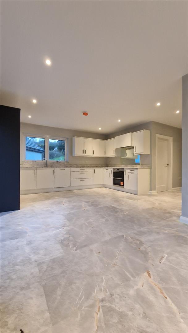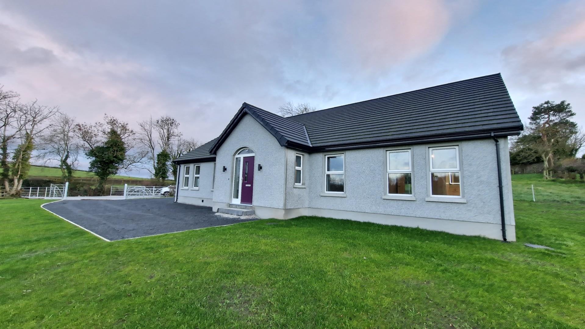 The bungalow boasts a luxury finish throughout. From the entrance hall is a modern family lounge and an open plan kitchen/dining/living area, utility room and WC. Off the hallway are 4 double bedrooms, the master benefitting from an en-suite and a there is also a beautiful family bathroom. The property is surrounded by gardens laid in lawn, low maintenance galvanised steel fencing, a tarmac driveway and a garage. There is surplus parking to the front and a gated entrance. The property avails of an air source heating pump which is excellent for heating your home and hot water. There is also an open fire in the lounge that backs onto the open plan kitchen as well as double glazing throughout, underfloor heating and the property is incredibly well insulated, therefore this home will keep you extra cosy through the winter.