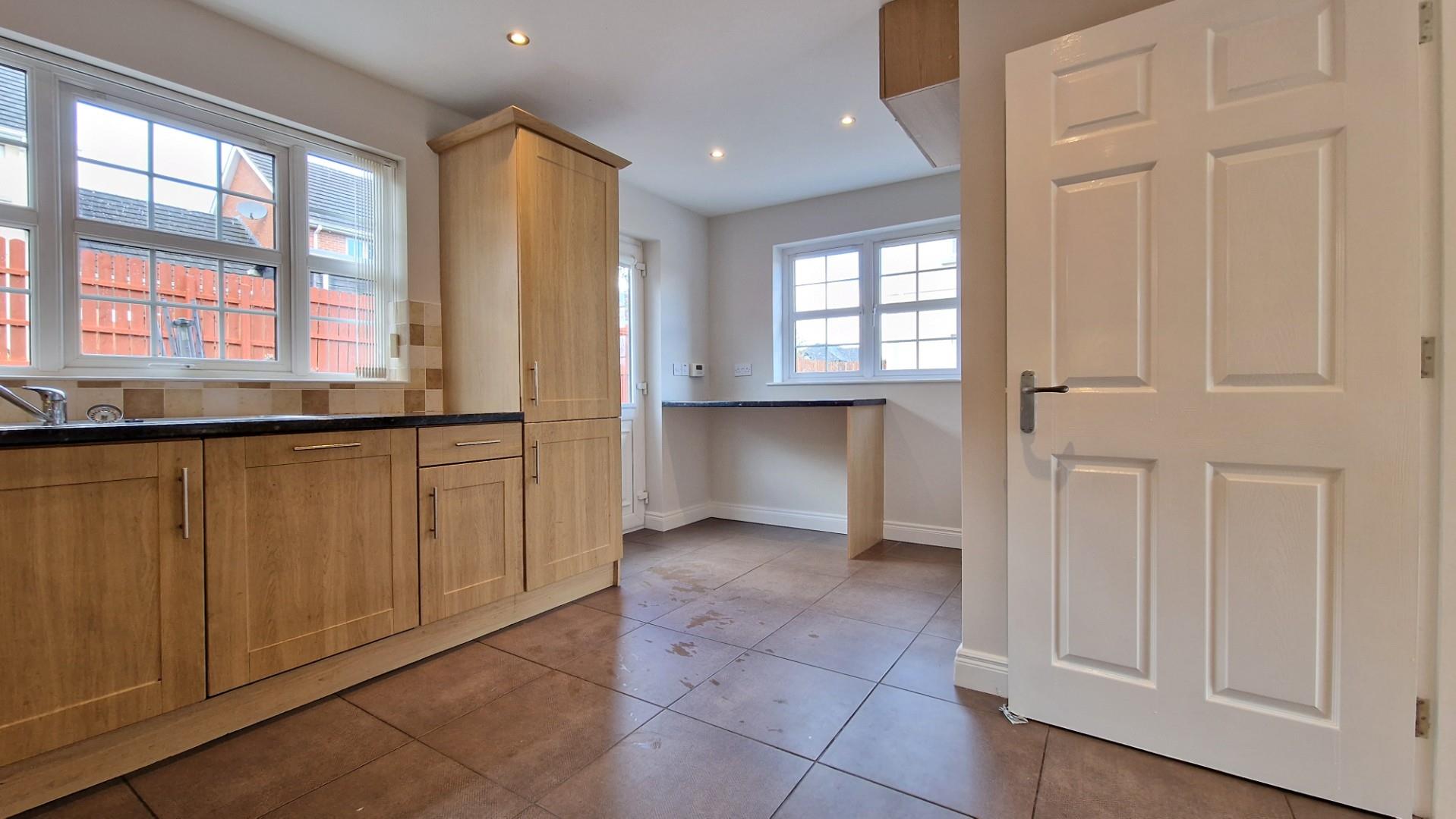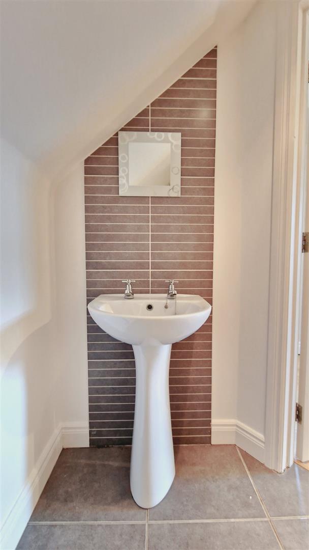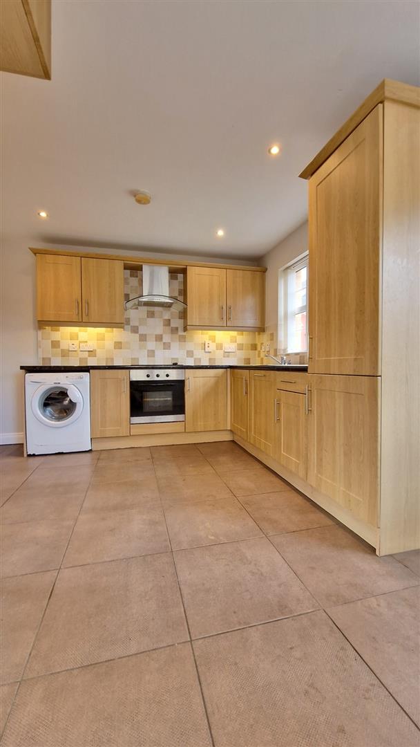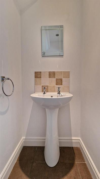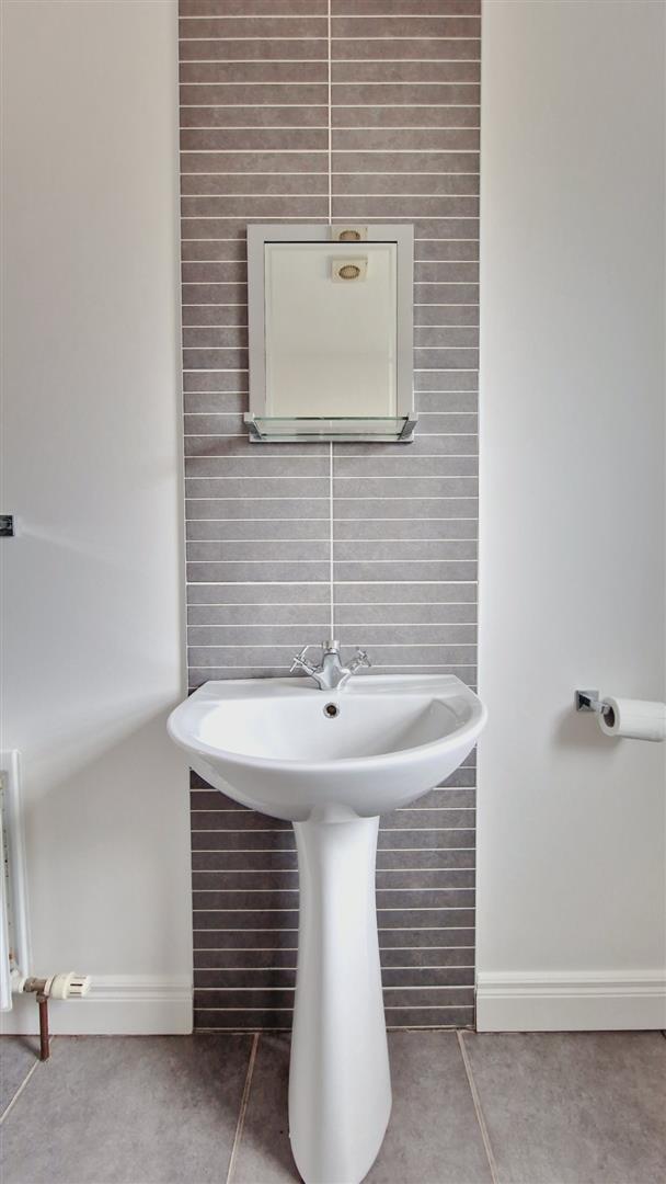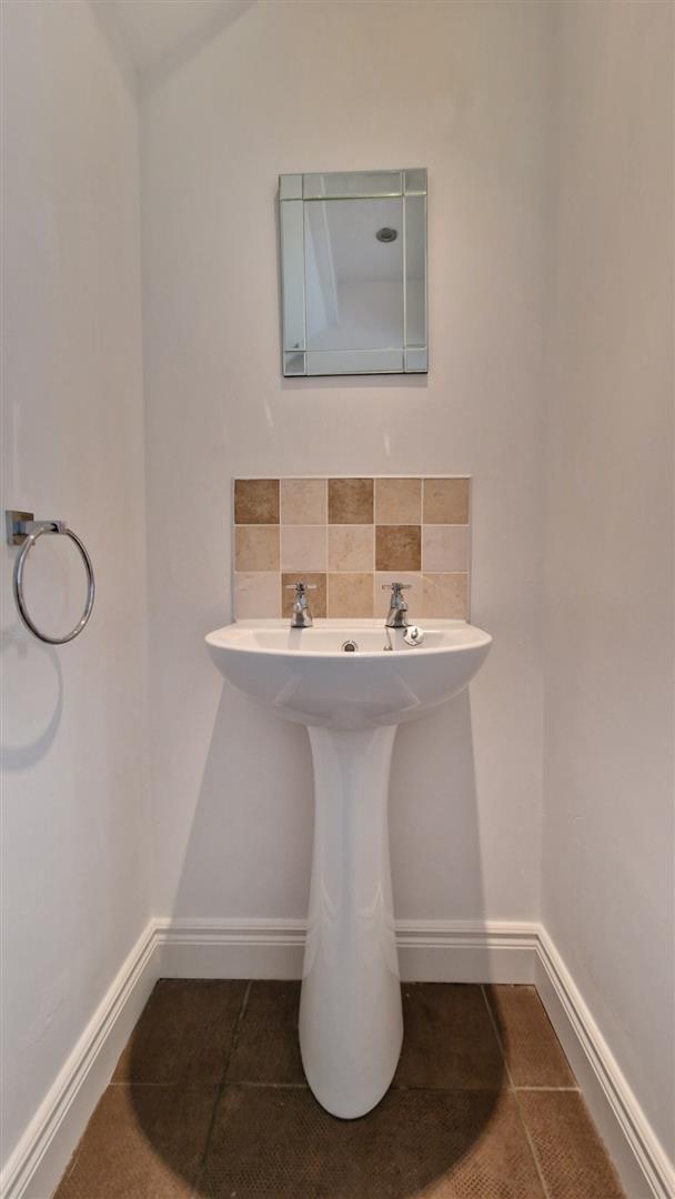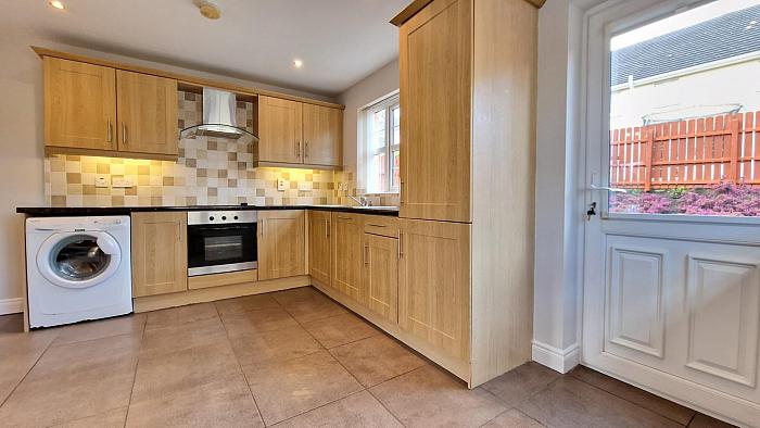 Range of high and low level units. Single drainer stainless steel sink unit with mono style mixer tap. Integrated oven and hob. Extractor hood in stainless steel and glass canopy with tiled splashback. Integrated dishwasher. Space for washing machine. PVC double glazed back door to rear garden. Adjoining cloakroom.