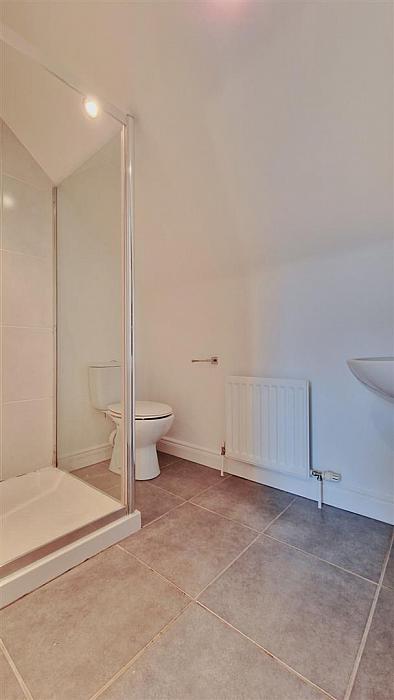 Large shower cubicle. Low flush wc. Close couple low flush wc. Wash hand basin with hot and cold taps and tiled splashback.
