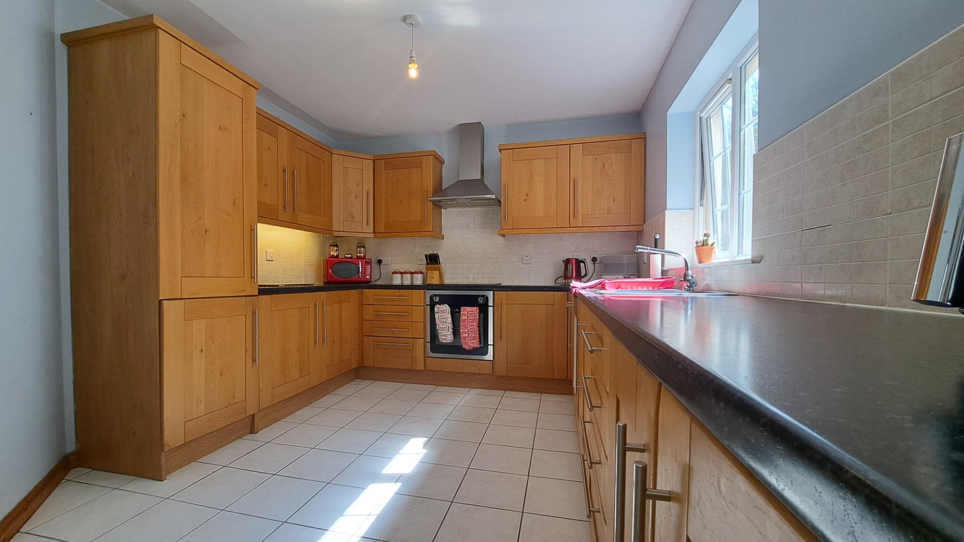 On entering the property, you are welcomed by a spacious hallway. The ground floor comprises the fourth bedroom, a WC, and a large integrated garage. Stairs lead to the first floor, which features a bright and spacious lounge with an open fire, as well as a family kitchen/diner. The kitchen boasts attractive shaker-style oak-effect units, laminate worktops, and patio doors opening onto the rear garden-perfect for family living and entertaining.