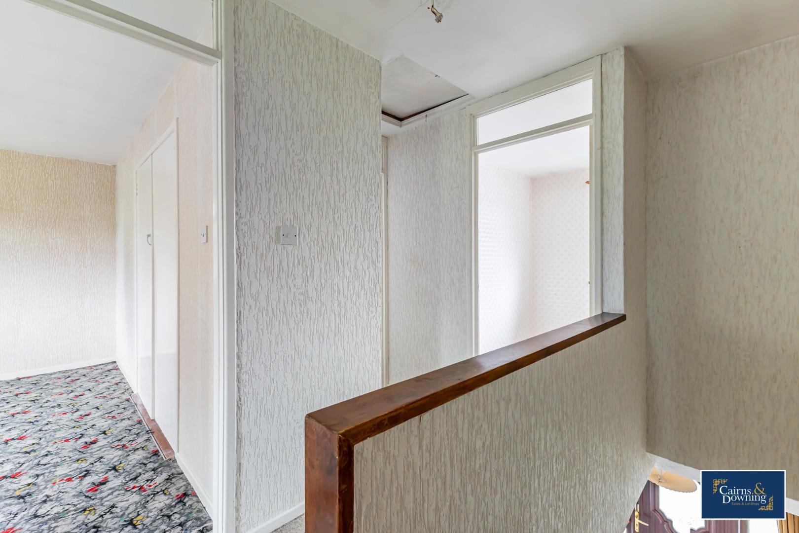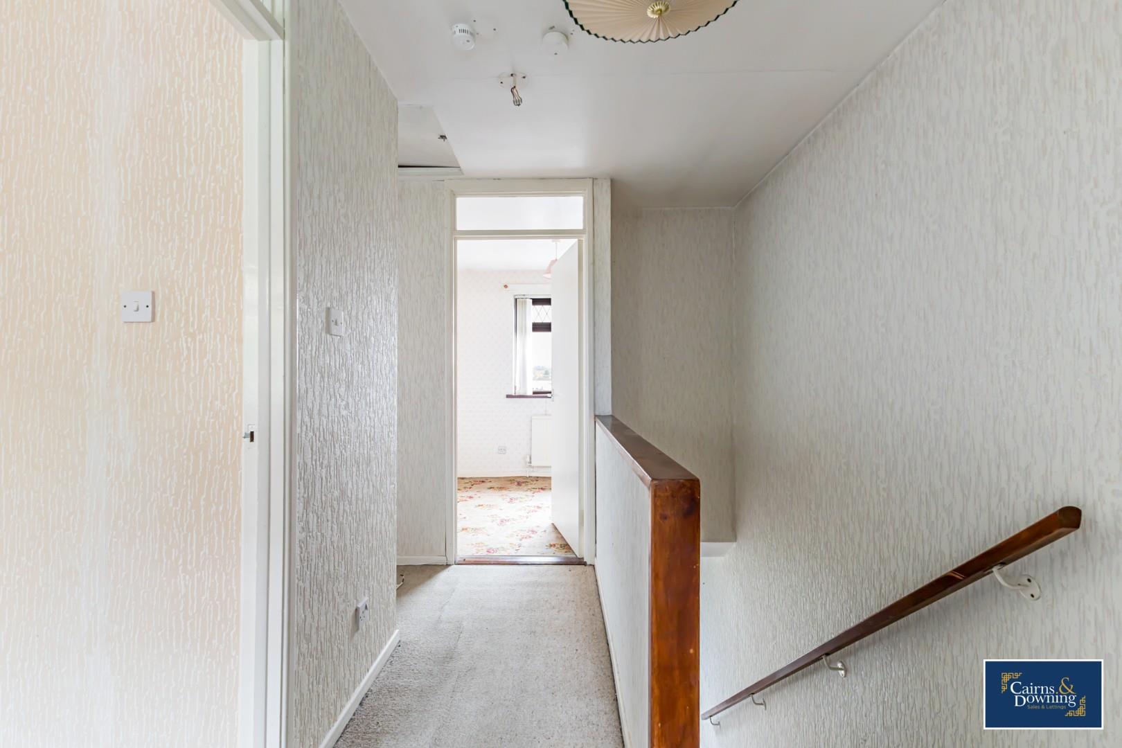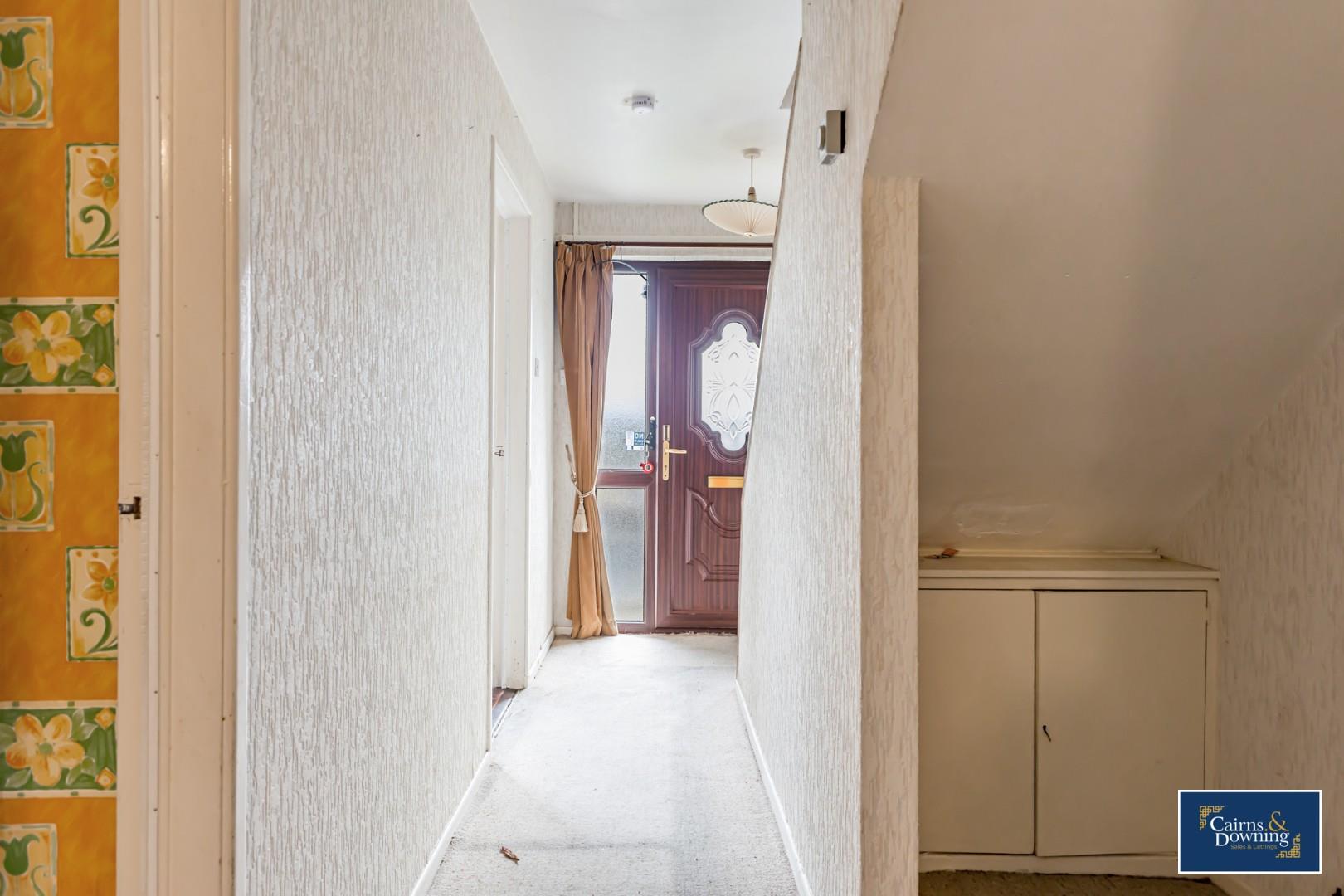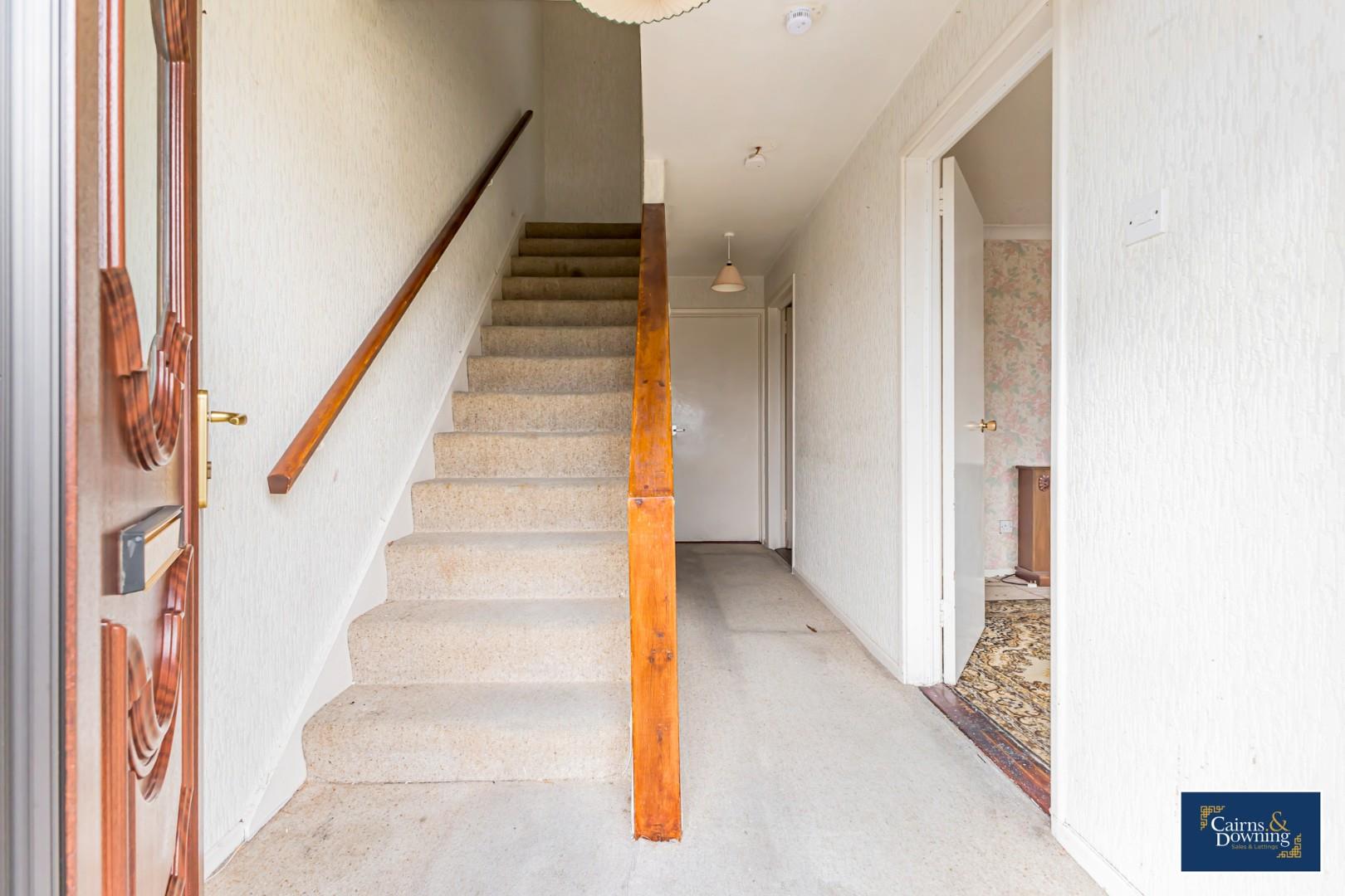 Two windows to front, stairs, door.